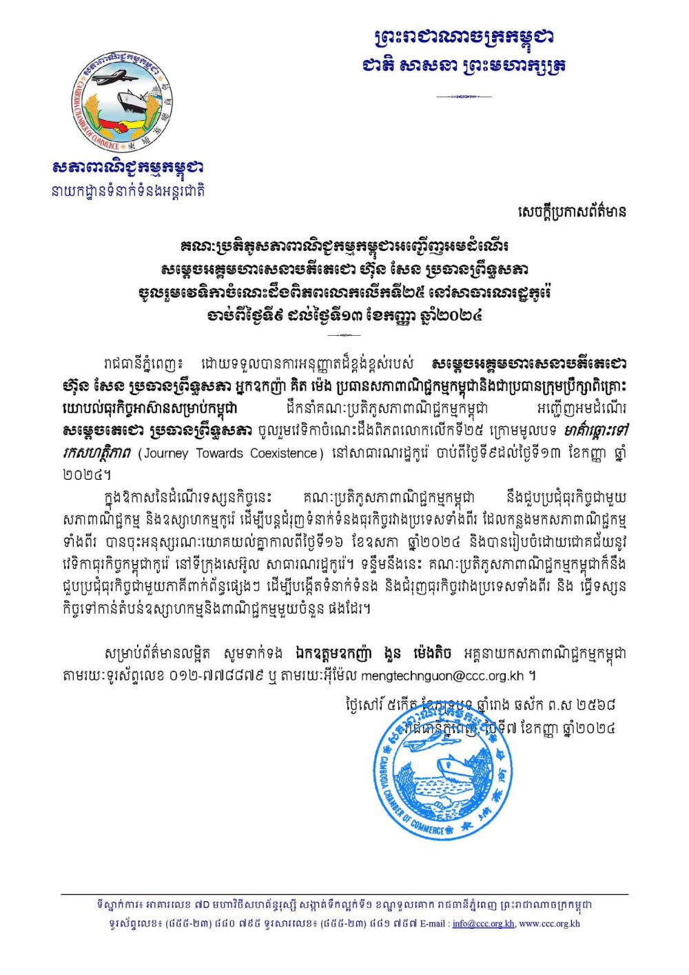គណៈប្រតិភូសភាពាណិជ្ជកម្មកម្ពុជាអញ្ជើញអមដំណើរ សម្តេចអគ្គមហាសេនាបតីតេជោ ហ៊ុន សែន ប្រធានព្រឹទ្ធសភា ចូលរួមវេទិកាចំណេះដឹងពិភពលោកលើកទី២៥ នៅសាធារណរដ្ឋកូរ៉េ ចាប់ពីថ្ងៃទី៩ ដល់ថ្ងៃទី១៣ ខែកញ្ញា ឆ្នាំ២០២៤