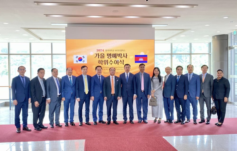 សាធារណរដ្ឋកូរ៉េ៖ នាព្រឹកថ្ងៃព្រហស្បតិ៍ ១០ កើត ខែភទ្របទ ឆ្នាំរោង ឆស័ក ព.ស ២៥៦៨ ត្រូវនឹងថ្ងៃទី១២ ខែកញ្ញា ឆ្នាំ២០២៤ អ្នកឧកញ៉ា គិត ម៉េង ប្រធានសភាពាណិជ្ជកម្មកម្ពុជា និងជាប្រធានក្រុមប្រឹក្សាពិគ្រោះយោបល់ធុរកិច្ចសម្រាប់អាស៊ាន រួមនិង គណៈប្រតិភូសភាពាណិជ្ជកម្មកម្ពុជា អញ្ជើញចូលរួម ពិធីប្រគល់សញ្ញាបត្របណ្ឌិតកិត្តិយស “ភាពជាអ្នកដឹកនាំ និងការកសាងសន្តិភាព” ពីសាកលវិទ្យាល័យដុងហ្គុកវ៉ាយស៍ ជូន សម្តេចអគ្គមហាសេនាបតីតេជោ ហ៊ុន សែន ប្រធានព្រឹទ្ធសភា។ ពិធីនេះប្រព្រឹត្តទៅនៅ សាកលវិទ្យាល័យដុងហ្គុកវ៉ាយស៍ ខេត្តឃ្យុងសាងបុកដូ សាធារណរដ្ឋកូរ៉េ។