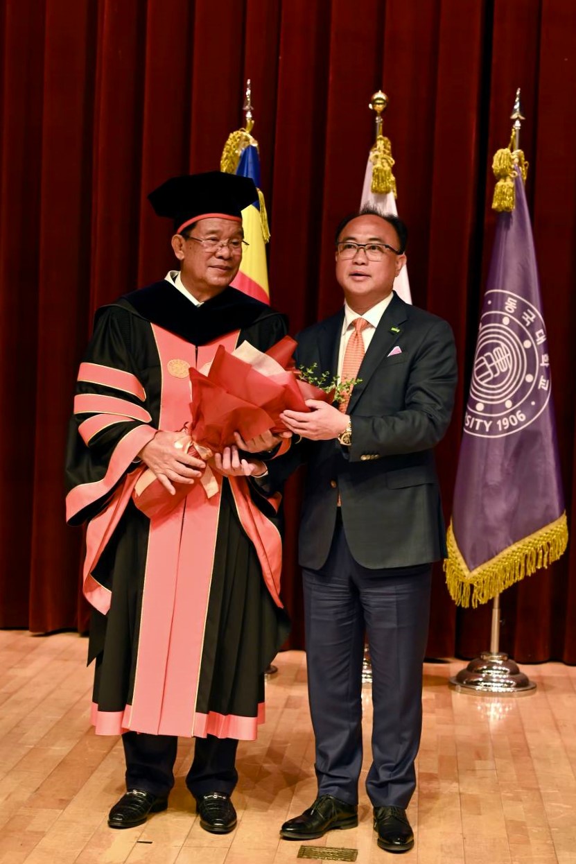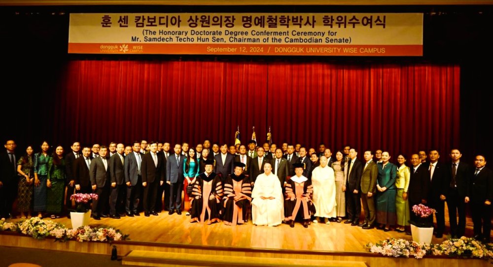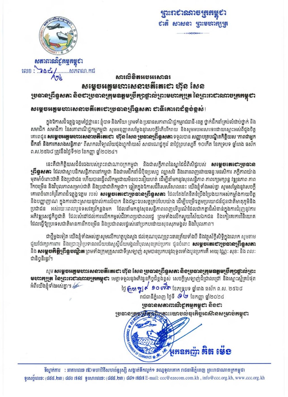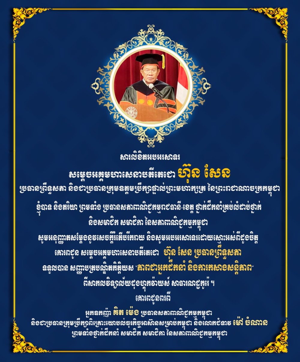 អ្នកឧកញ៉ា គិត ម៉េង ប្រធានសភាពាណិជ្ជកម្មកម្ពុជា និងជា ប្រធានក្រុមប្រឹក្សាពិគ្រោះយោបល់ធុរកិច្ចអាស៊ានសម្រាប់កម្ពុជា និង លោកជំទាវ ព្រមទាំង ប្រធានសភាពាណិជ្ជកម្មរាជធានី-ខេត្ត ថ្នាក់ដឹកនាំគ្រប់លំដាប់ថ្នាក់ និងសមាជិក សមាជិកា នៃសភាពាណិជ្ជកម្មកម្ពុជា សូមអនុញ្ញាតសម្តែងនូវសេចក្តីរំភើបរីករាយ និងសូមអបអរសារទរដោយស្មោះអស់ពីដួងចិត្ត គោរពជូន សម្តេចអគ្គមហាសេនាបតីតេជោ ហ៊ុន សែន ប្រធានព្រឹទ្ធសភា ដែលទទួលបាន សញ្ញាបត្របណ្ឌិតកិត្តិយស “ភាពជាអ្នកដឹកនាំ និងការកសាងសន្តិភាព” ពីសាកលវិទ្យាល័យដុងហ្គុកវ៉ាយស៍ សាធារណដ្ឋកូរ៉េ នាថ្ងៃព្រហស្បតិ៍ ១០កើត ខែភទ្របទ ឆ្នាំរោង ឆស័ក ព.ស.២៥៦៨ ត្រូវនឹងថ្ងៃទី១២ ខែកញ្ញា ឆ្នាំ២០២៤។