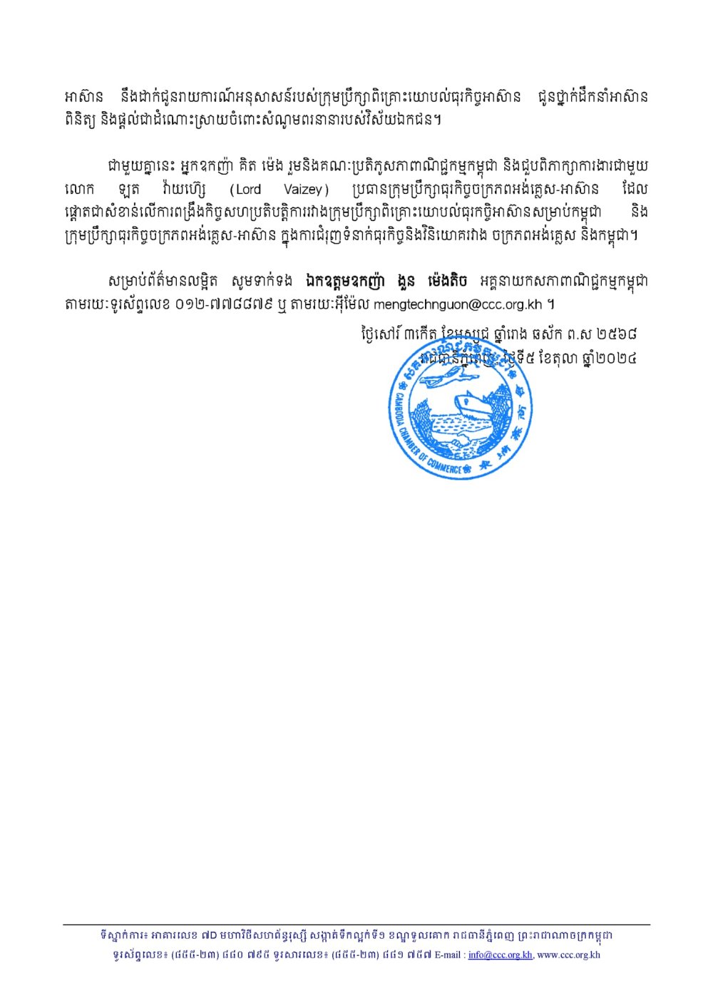 រាជធានីភ្នំពេញ៖ ដោយទទួលបានការអនុញ្ញាតដ៏ខ្ពង់ខ្ពស់របស់ សម្តេចមហាបវរធិបតី ហ៊ុន ម៉ាណែត នាយករដ្ឋមន្ត្រីនៃព្រះរាជាណាចក្រកម្ពុជា អ្នកឧកញ៉ា គិត ម៉េង ប្រធានសភាពាណិជ្ជកម្មកម្ពុជានិងជាប្រធានក្រុមប្រឹក្សាពិគ្រោះយោបល់ធុរកិច្ចអាស៊ានសម្រាប់កម្ពុជា ដឹកនាំគណៈប្រតិភូសភាពាណិជ្ជកម្មកម្ពុជា អញ្ជើញអមដំណើរ