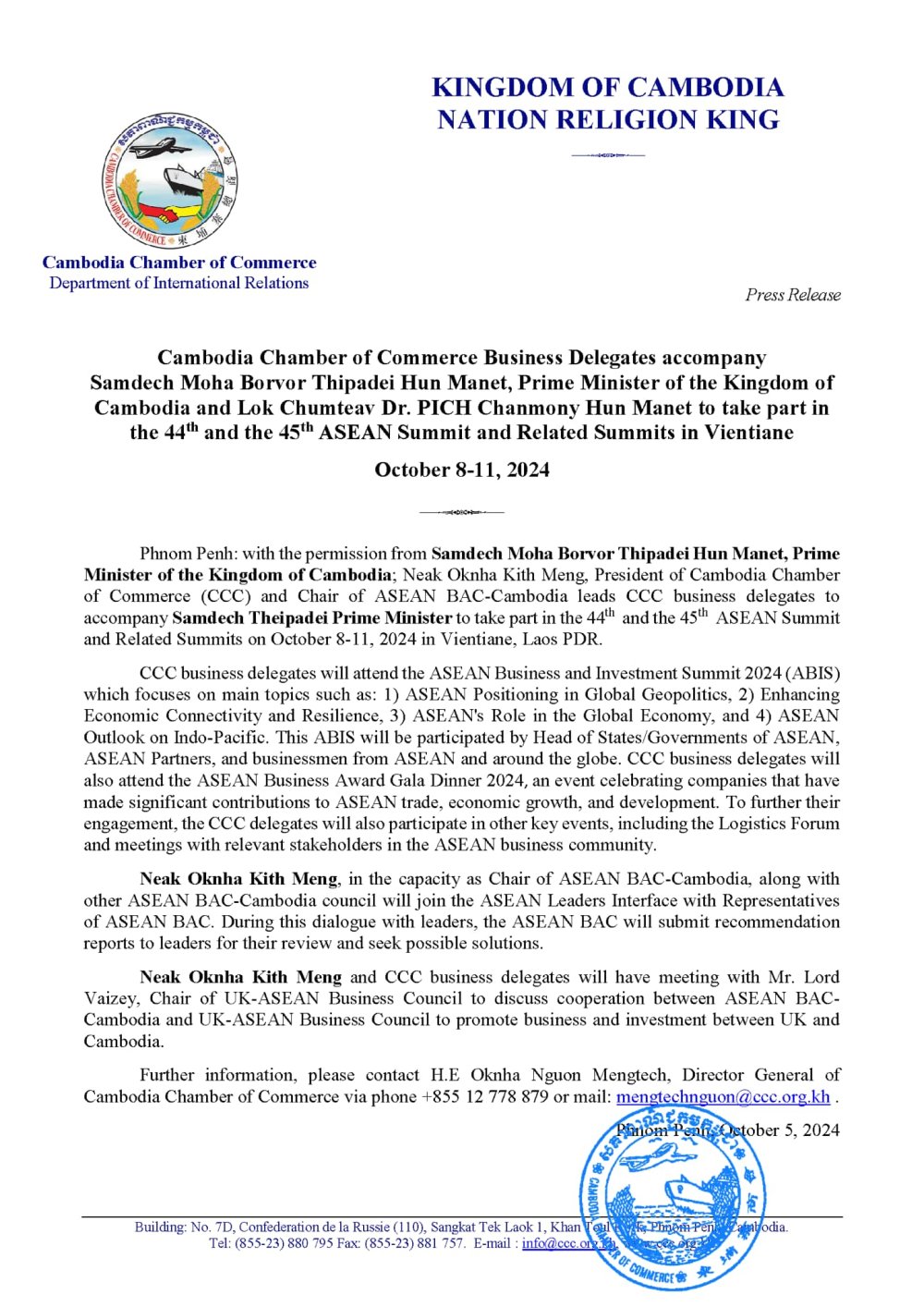 គណៈប្រតិភូសភាពាណិជ្ជកម្មកម្ពុជាអញ្ជើញអមដំណើរ សម្តេចមហាបវរធិបតី ហ៊ុន ម៉ាណែត នាយករដ្ឋមន្ត្រីនៃព្រះរាជាណាចក្រកម្ពុជា និង លោកជំទាវបណ្ឌិត ពេជ ចន្ទមុន្នី ហ៊ុន ម៉ាណែត ចូលរួមកិច្ចប្រជុំកំពូលអាស៊ានលើកទី៤៤ និង៤៥ និងកិច្ចប្រជុំកំពូលពាក់ព័ន្ធ នៅរដ្ឋធានីវៀងចន្ទន៍