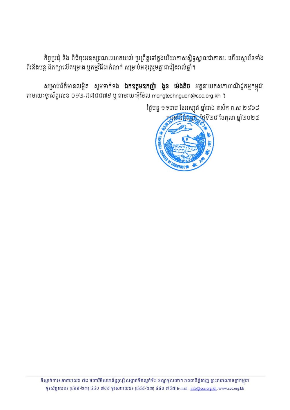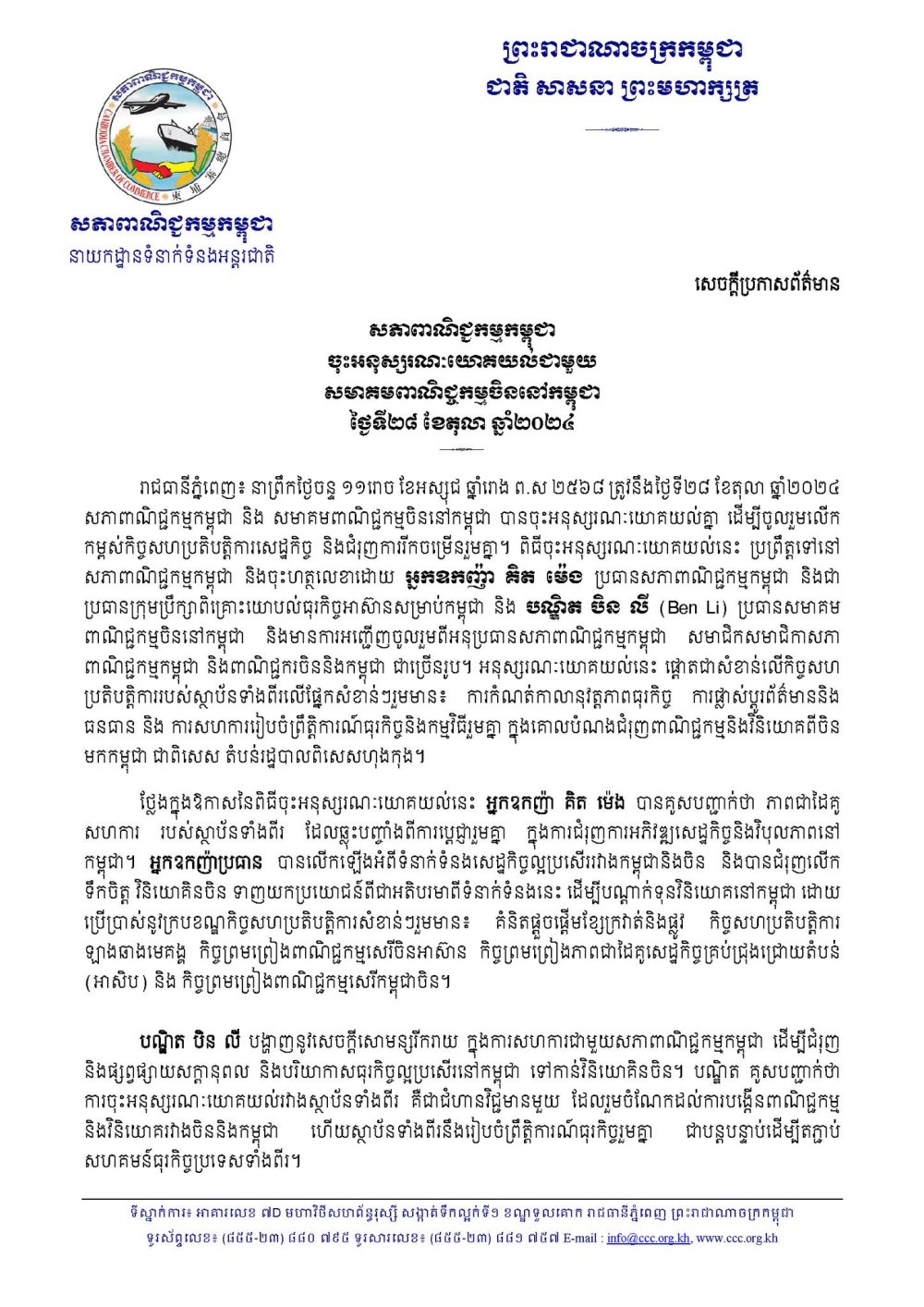 រាជធានីភ្នំពេញ៖ នាព្រឹកថ្ងៃចន្ទ ១១រោច ខែអស្សុជ ឆ្នាំរោង ព.ស ២៥៦៨ ត្រូវនឹងថ្ងៃទី២៨ ខែតុលា ឆ្នាំ២០២៤ សភាពាណិជ្ជកម្មកម្ពុជា និង សមាគមពាណិជ្ជកម្មចិននៅកម្ពុជា បានចុះអនុស្សរណៈយោគយល់គ្នា ដើម្បីចូលរួមលើកកម្ពស់កិច្ចសហប្រតិបត្តិការសេដ្ឋកិច្ច និងជំរុញការរីកចម្រើនរួមគ្នា។ ពិធីចុះអនុស្សរណៈយោគយល់នេះ ប្រព្រឹត្តទៅនៅសភាពាណិជ្ជកម្មកម្ពុជា និងចុះហត្ថលេខាដោយ អ្នកឧកញ៉ា គិត ម៉េង ប្រធានសភាពាណិជ្ជកម្មកម្ពុជា និងជាប្រធានក្រុមប្រឹក្សាពិគ្រោះយោបល់ធុរកិច្ចអាស៊ានសម្រាប់កម្ពុជា និង បណ្ឌិត បិន លី (Ben Li) ប្រធានសមាគមពាណិជ្ជកម្មចិននៅកម្ពុជា និងមានការអញ្ជើញចូលរួមពីអនុប្រធានសភាពាណិជ្ជកម្មកម្ពុជា សមាជិកសមាជិកាសភាពាណិជ្ជកម្មកម្ពុជា និងពាណិជ្ជករចិននិងកម្ពុជា ជាច្រើនរូប។ អនុស្សរណៈយោគយល់នេះ ផ្តោតជាសំខាន់លើកិច្ចសហប្រតិបត្តិការរបស់ស្ថាប័នទាំងពីរលើផ្នែកសំខាន់ៗរួមមាន៖ ការកំណត់កាលានុវត្តភាពធុរកិច្ច ការផ្លាស់ប្តូរព័ត៌មាននិងធនធាន និង ការសហការរៀបចំព្រឹត្តិការណ៍ធុរកិច្ចនិងកម្មវិធីរួមគ្នា ក្នុងគោលបំណងជំរុញពាណិជ្ជកម្មនិងវិនិយោគពីចិនមកកម្ពុជា ជាពិសេស តំបន់រដ្ឋបាលពិសេសហុងកុង។