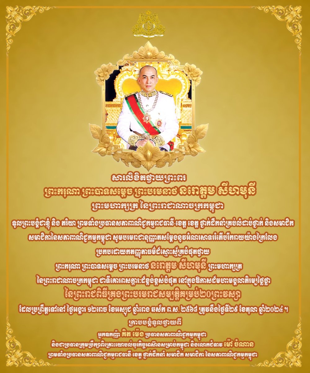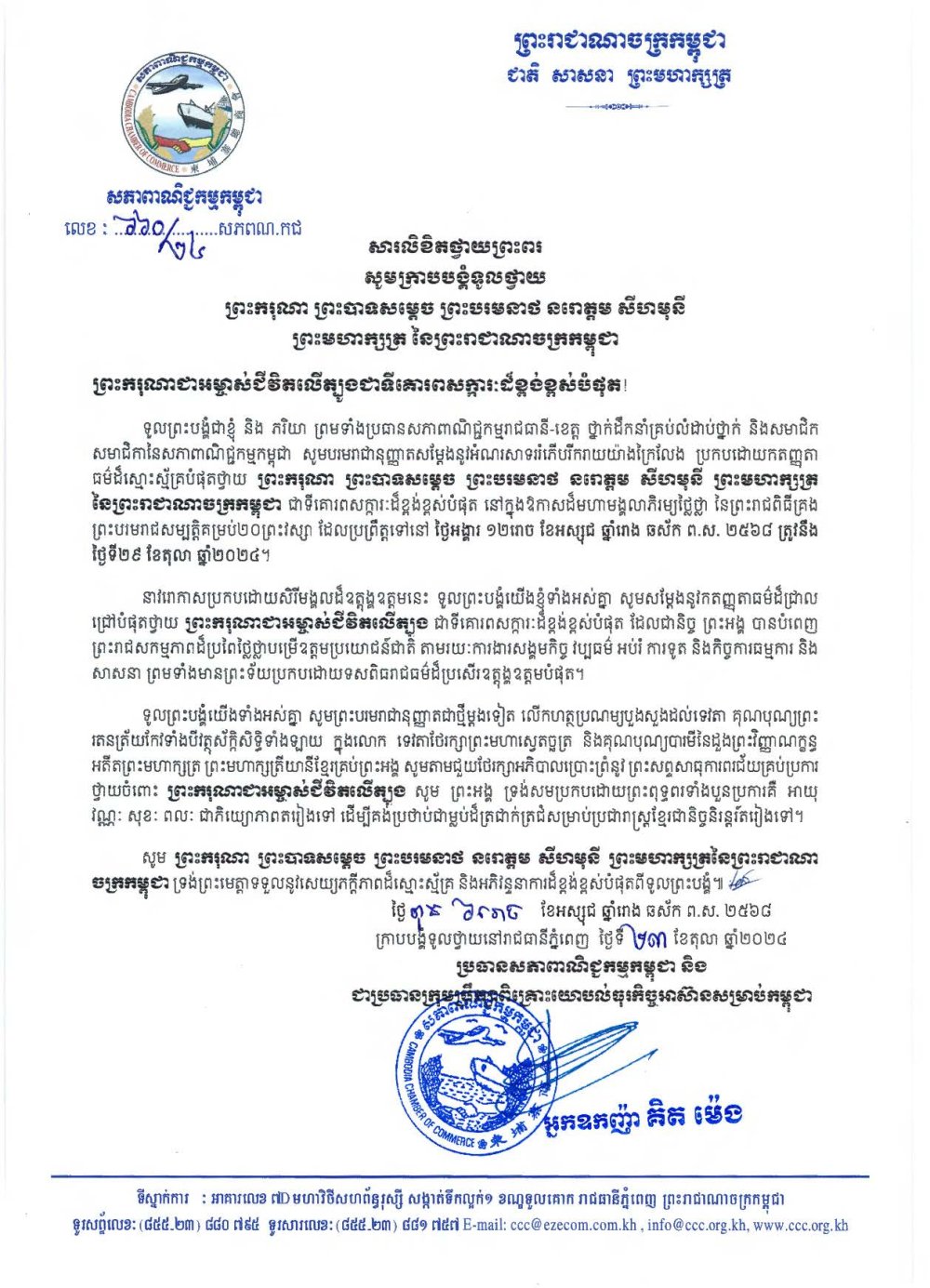 (រាជធានីភ្នំពេញ)៖នាព្រឹកថ្ងៃពុធ ១៣ រោច ខែអស្សុជ ឆ្នាំរោង ឆស័ក ព.ស. ២៥៦៨ ត្រូវនឹងថ្ងៃទី៣០ ខែតុលា ឆ្នាំ២០២៤ គណៈប្រតិភូសភាពាណិជ្ជកម្មកម្ពុជា បានអញ្ជើញចូលរួម «ព្រះរាជពិធីមហាមិទ្ទីញខួបលើកទី២០ នៃការគ្រងព្រះបរមសិរីរាជសម្បត្តិ ថ្វាយ ព្រះករុណាព្រះបាទសម្តេច ព្រះបរមនាថ នរោត្តម សីហមុនី ព្រះមហាក្សត្រ នៃព្រះរាជាណាចក្រកម្ពុជា ជាទីគោរពសក្ការៈដ៏ខ្ពង់ខ្ពស់បំផុត» ដែលប្រារព្ធធ្វើឡើងនៅមុខព្រះទីនាំងចន្ទឆាយា ព្រះបរមរាជវាំង។
