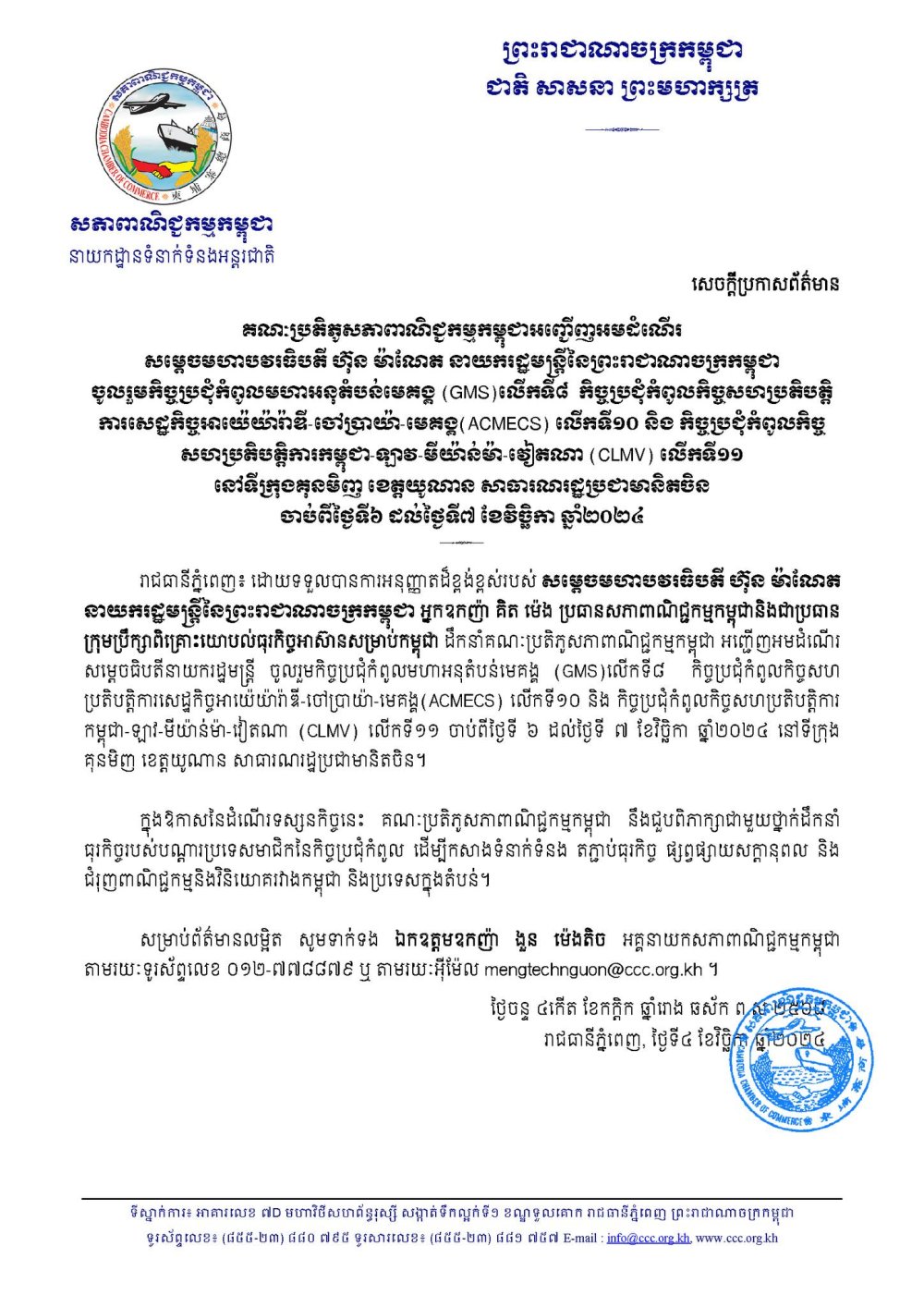 សម្តេចធិបតីនាយករដ្ឋមន្ត្រី ចូលរួមកិច្ចប្រជុំកំពូលមហាអនុតំបន់មេគង្គ (GMS)លើកទី៨ កិច្ចប្រជុំកំពូលកិច្ចសហប្រតិបត្តិការសេដ្ឋកិច្ចអាយ៉េយ៉ារ៉ាឌី-ចៅប្រាយ៉ា-មេគង្គ(ACMECS) លើកទី១០ និង កិច្ចប្រជុំកំពូលកិច្ចសហប្រតិបត្តិការកម្ពុជា-ឡាវ-មីយ៉ាន់ម៉ា-វៀតណា (CLMV) លើកទី១១ ចាប់ពីថ្ងៃទី ៦ ដល់ថ្ងៃទី ៧ ខែវិច្ឆិកា ឆ្នាំ២០២៤ នៅទីក្រុង គុនមិញ ខេត្តយូណាន សាធារណរដ្ឋប្រជាមានិតចិន។