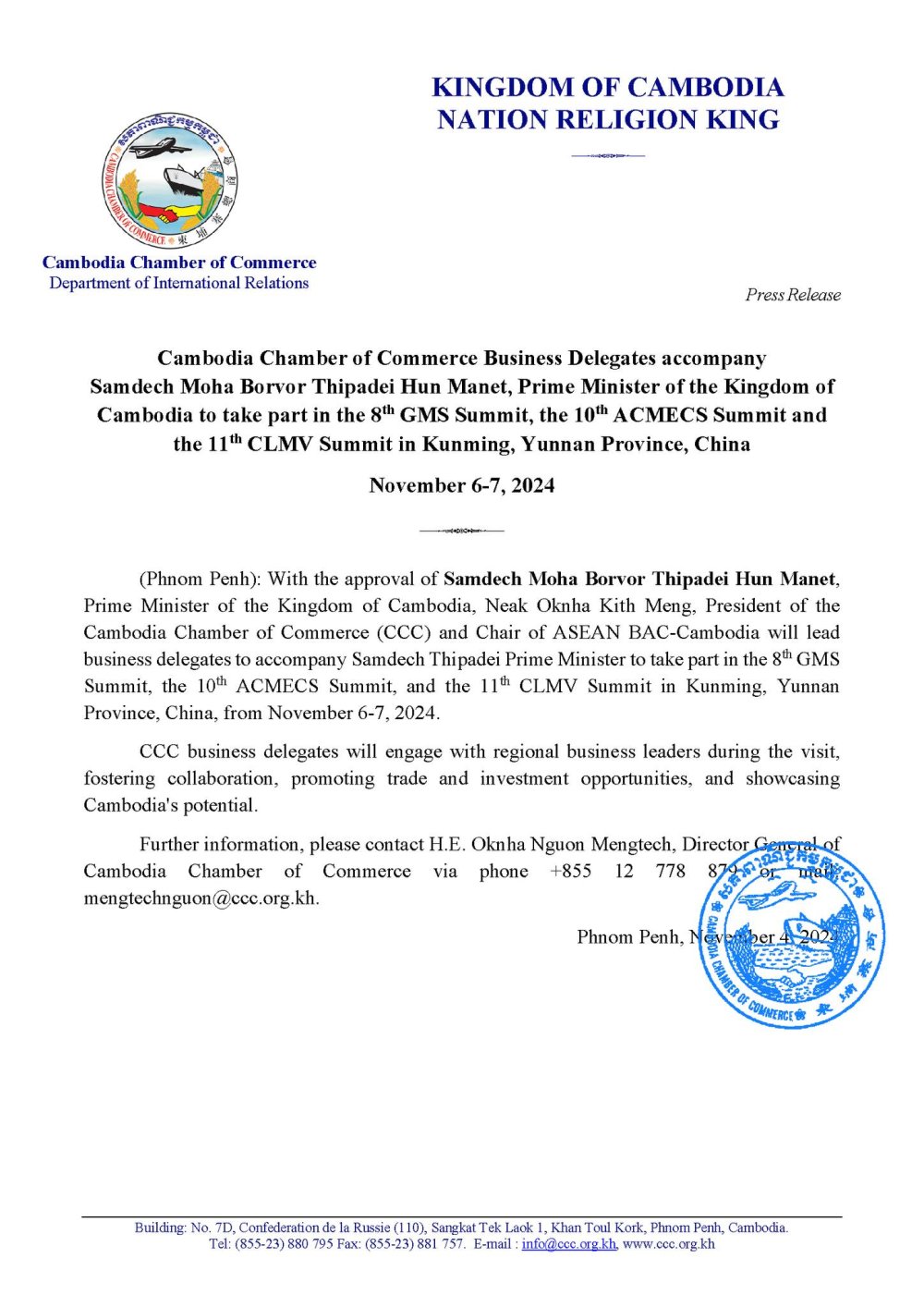 គណៈប្រតិភូសភាពាណិជ្ជកម្មកម្ពុជាអញ្ជើញអមដំណើរ សម្តេចមហាបវរធិបតី ហ៊ុន ម៉ាណែត នាយករដ្ឋមន្ត្រីនៃព្រះរាជាណាចក្រកម្ពុជា ចូលរួមកិច្ចប្រជុំកំពូលមហាអនុតំបន់មេគង្គ (GMS)លើកទី៨ កិច្ចប្រជុំកំពូលកិច្ចសហប្រតិបត្តិការសេដ្ឋកិច្ចអាយ៉េយ៉ារ៉ាឌី-ចៅប្រាយ៉ា-មេគង្គ(ACMECS) លើកទី១០ និង កិច្ចប្រជុំកំពូលកិច្ចសហប្រតិបត្តិការកម្ពុជា-ឡាវ-មីយ៉ាន់ម៉ា-វៀតណា (CLMV) លើកទី១១ នៅទីក្រុងគុនមិញ ខេត្តយូណាន សាធារណរដ្ឋប្រជាមានិតចិន