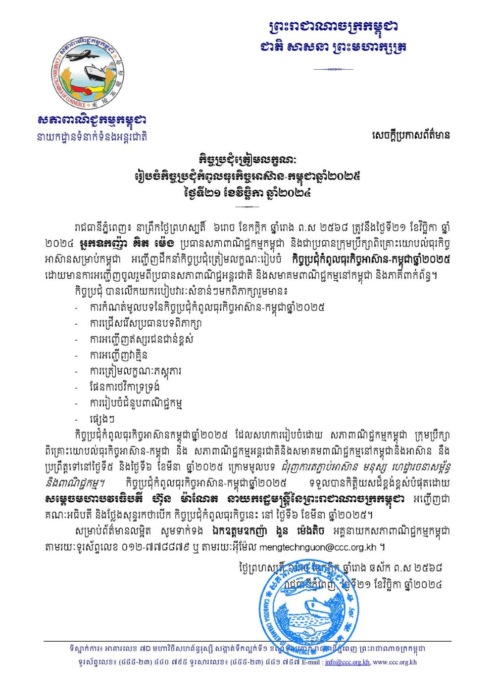 អាស៊ានសម្រាប់កម្ពុជា អញ្ជើញដឹកនាំកិច្ចប្រជុំត្រៀមលក្ខណៈរៀបចំ កិច្ចប្រជុំកំពូលធុរកិច្ចអាស៊ាន-កម្ពុជាឆ្នាំ២០២៥ ដោយមានការអញ្ជើញចូលរួមពីប្រធានសភាពាណិជ្ជអន្តរជាតិ និងសមាគមពាណិជ្ជកម្មនៅកម្ពុជា និងភាគីពាក់ព័ន្ធ។