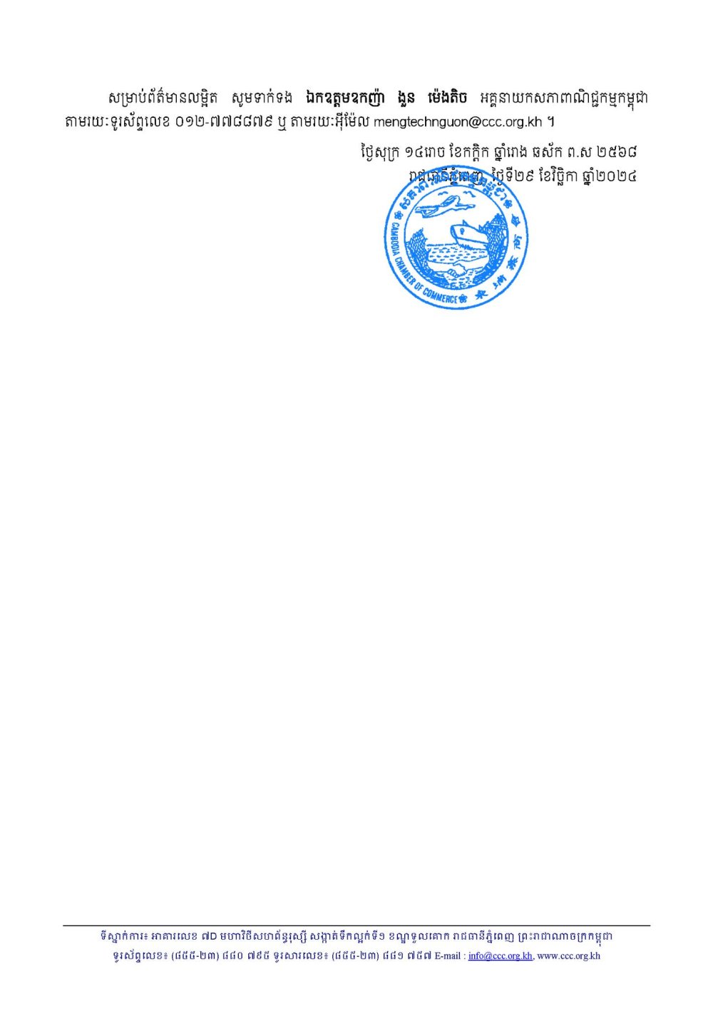 រាជធានីភ្នំពេញ៖ នាព្រឹកថ្ងៃសុក្រ ១៤រោច ខែកក្តិក ឆ្នាំរោង ព.ស ២៥៦៨ ត្រូវនឹងថ្ងៃទី២៩ ខែវិច្ឆិកា ឆ្នាំ២០២៤ អ្នកឧកញ៉ា គិត ម៉េង ប្រធានសភាពាណិជ្ជកម្មកម្ពុជា និងជាប្រធានក្រុមប្រឹក្សាពិគ្រោះយោបល់ធុរកិច្ច អាស៊ានសម្រាប់កម្ពុជា ទទួលជួបពិភាក្សាការងារជាមួយគណៈប្រតិភូធុរកិច្ចសមាគមអ្នកចែកចាយយានយន្តខេត្តក្វាងទុងប្រទេសចិន ដែលដឹកនាំដោយ លោកស្រី យាន ហ្វេយ (Yan Fei) ប្រធានសមាគមអ្នកចែកចាយយានយន្តខេត្តក្វាងទុង។ គណៈប្រតិភូធុរកិច្ចខេត្តក្វាងទុង កំពុងបំពេញទស្សនកិច្ចនៅកម្ពុជា ដើម្បីស្វែងរកកាលានុវត្តភាពវិនិយោគ និង កិច្ចសហប្រតិបត្តិការ ក្នុងវិស័យយានយន្តនៅកម្ពុជាដែលកំពុងរីកច្រើនយ៉ាងឆាប់រហ័ស។