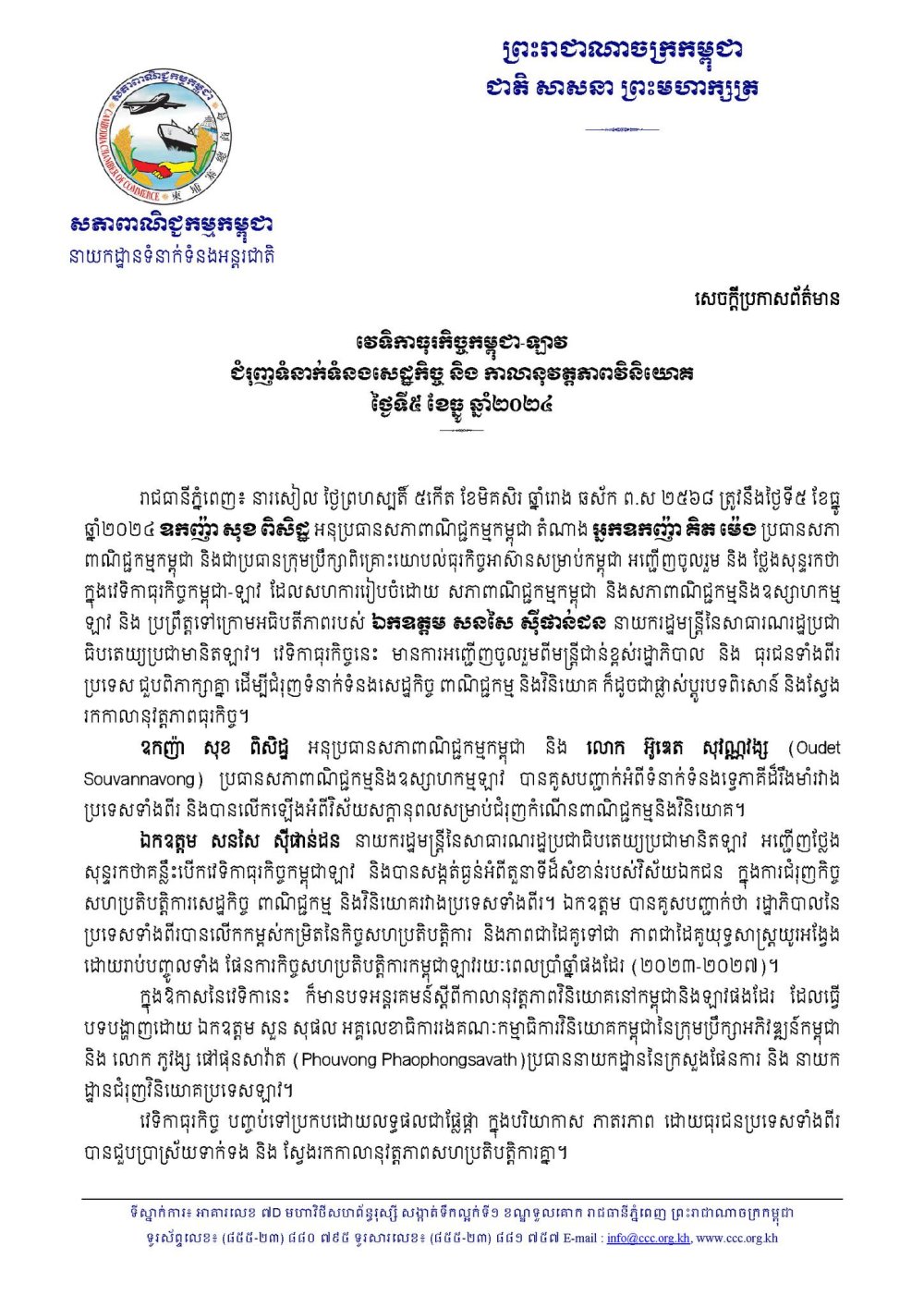 រាជធានីភ្នំពេញ៖ នារសៀល ថ្ងៃព្រហស្បតិ៍ ៥កើត ខែមិគសិរ ឆ្នាំរោង ឆស័ក ព.ស ២៥៦៨ ត្រូវនឹងថ្ងៃទី៥ ខែធ្នូ ឆ្នាំ២០២៤ ឧកញ៉ា សុខ ពិសិដ្ឋ អនុប្រធានសភាពាណិជ្ជកម្មកម្ពុជា តំណាង អ្នកឧកញ៉ា គិត ម៉េង ប្រធានសភាពាណិជ្ជកម្មកម្ពុជា និងជាប្រធានក្រុមប្រឹក្សាពិគ្រោះយោបល់ធុរកិច្ចអាស៊ានសម្រាប់កម្ពុជា អញ្ជើញចូលរួម និង ថ្លែងសុន្ទរកថា ក្នុងវេទិកាធុរកិច្ចកម្ពុជា-ឡាវ ដែលសហការរៀបចំដោយ សភាពាណិជ្ជកម្មកម្ពុជា និងសភាពាណិជ្ជកម្មនិងឧស្សាហកម្មឡាវ និង ប្រព្រឹត្តទៅក្រោមអធិបតីភាពរបស់ ឯកឧត្តម សនសៃ ស៊ីផាន់ដន នាយករដ្ឋមន្ត្រីនៃសាធារណរដ្ឋប្រជាធិបតេយ្យប្រជាមានិតឡាវ។ វេទិកាធុរកិច្ចនេះ មានការអញ្ជើញចូលរួមពីមន្ត្រីជាន់ខ្ពស់រដ្ឋាភិបាល និង ធុរជនទាំងពីរប្រទេស ជួបពិភាក្សាគ្នា ដើម្បីជំរុញទំនាក់ទំនងសេដ្ឋកិច្ច ពាណិជ្ជកម្ម និងវិនិយោគ ក៏ដូចជាផ្លាស់ប្តូរបទពិសោន៍ និងស្វែងរកកាលានុវត្តភាពធុរកិច្ច។