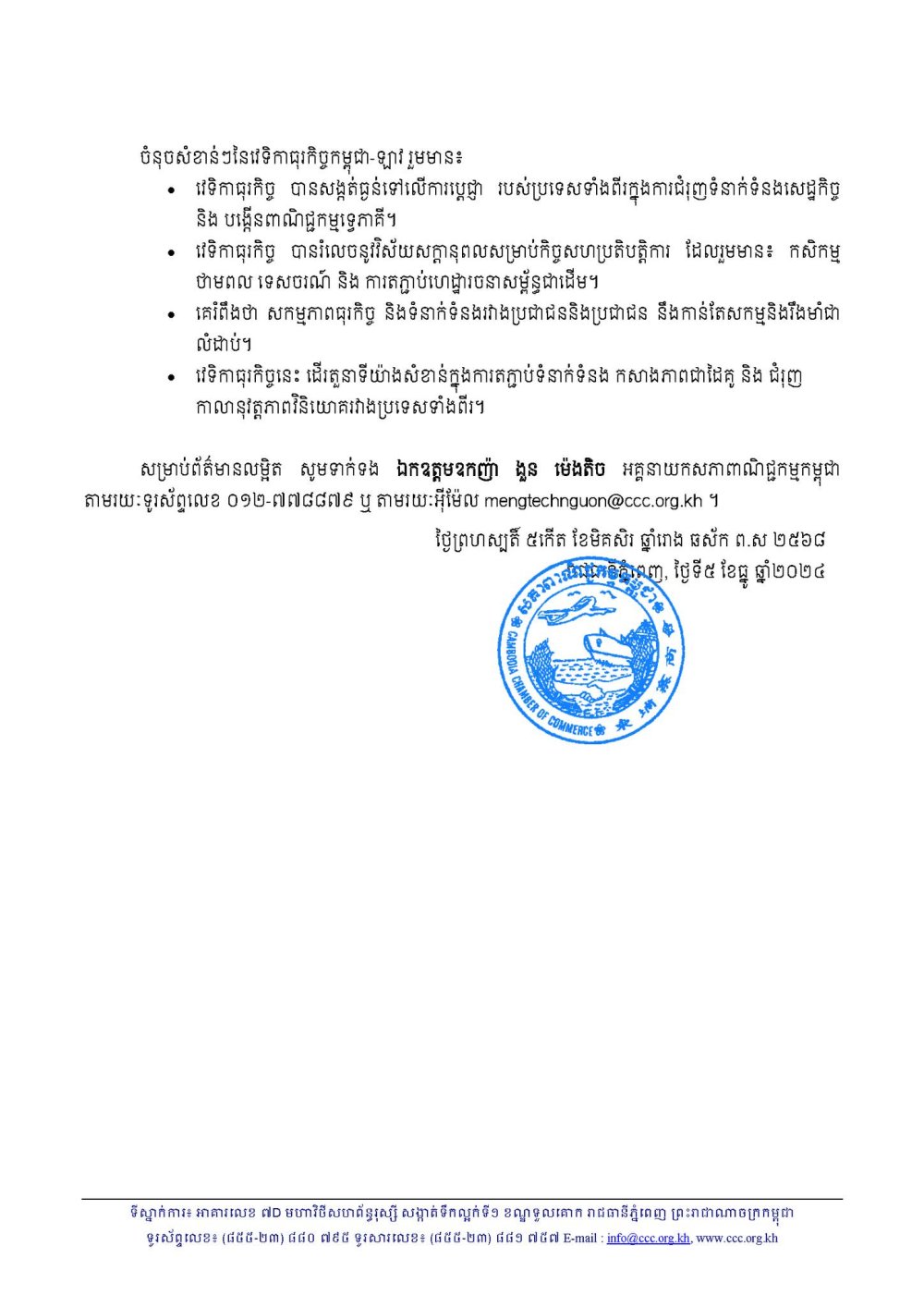 • វេទិកាធុរកិច្ច បានសង្កត់ធ្ងន់ទៅលើការប្តេជ្ញា របស់ប្រទេសទាំងពីរក្នុងការជំរុញទំនាក់ទំនងសេដ្ឋកិច្ច និង បង្កើនពាណិជ្ជកម្មទ្វេភាគី។