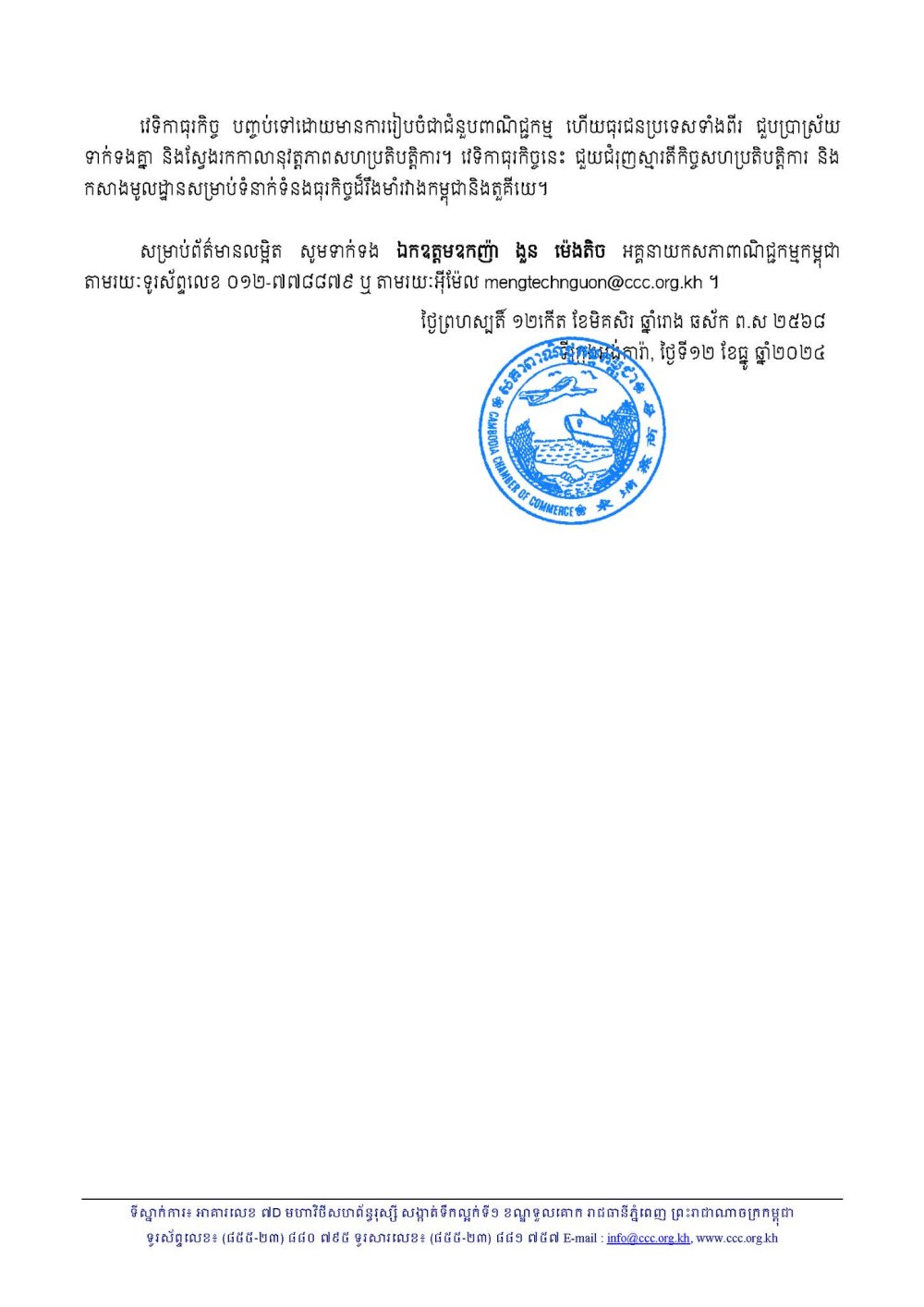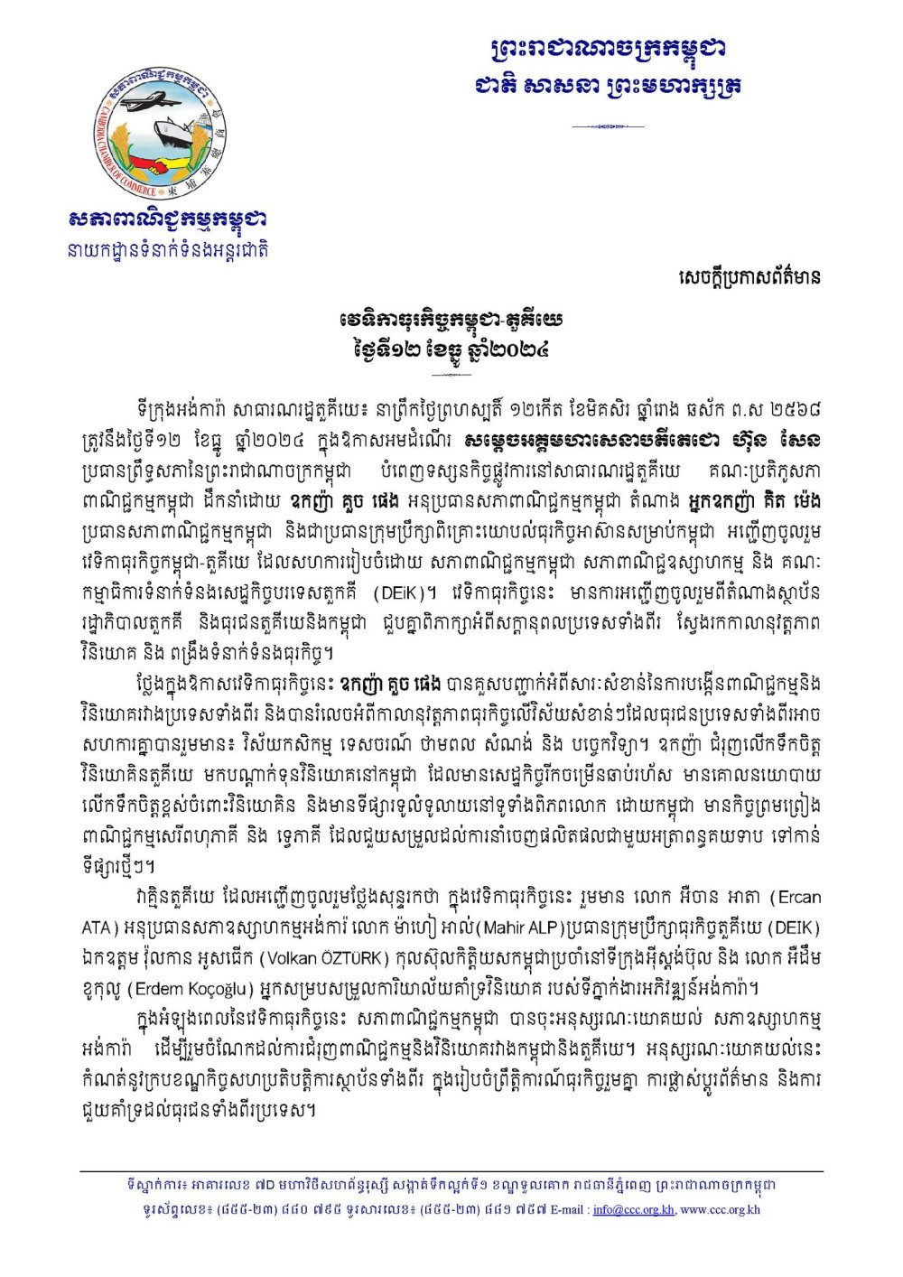 ទីក្រុងអង់ការ៉ា សាធារណរដ្ឋតួគីយេ៖ នាព្រឹកថ្ងៃព្រហស្បតិ៍ ១២កើត ខែមិគសិរ ឆ្នាំរោង ឆស័ក ព.ស ២៥៦៨ ត្រូវនឹងថ្ងៃទី១២ ខែធ្នូ ឆ្នាំ២០២៤ ក្នុងឱកាសអមដំណើរ សម្តេចអគ្គមហាសេនាបតីតេជោ ហ៊ុន សែន ប្រធានព្រឹទ្ធសភានៃព្រះរាជាណាចក្រកម្ពុជា បំពេញទស្សនកិច្ចផ្លូវការនៅសាធារណរដ្ឋតួគីយេ គណៈប្រតិភូសភាពាណិជ្ជកម្មកម្ពុជា ដឹកនាំដោយ ឧកញ៉ា គួច ផេង អនុប្រធានសភាពាណិជ្ជកម្មកម្ពុជា តំណាង អ្នកឧកញ៉ា គិត ម៉េង ប្រធានសភាពាណិជ្ជកម្មកម្ពុជា និងជាប្រធានក្រុមប្រឹក្សាពិគ្រោះយោបល់ធុរកិច្ចអាស៊ានសម្រាប់កម្ពុជា អញ្ជើញចូលរួមវេទិកាធុរកិច្ចកម្ពុជា-តួគីយេ ដែលសហការរៀបចំដោយ សភាពាណិជ្ជកម្មកម្ពុជា សភាពាណិជ្ជឧស្សាហកម្ម និង គណៈកម្មាធិការទំនាក់ទំនងសេដ្ឋកិច្ចបរទេសតួកគី (DEiK)។ វេទិកាធុរកិច្ចនេះ មានការអញ្ជើញចូលរួមពីតំណាងស្ថាប័នរដ្ឋាភិបាលតួកគី និងធុរជនតួគីយេនិងកម្ពុជា ជួបគ្នាពិភាក្សាអំពីសក្តានុពលប្រទេសទាំងពីរ ស្វែងរកកាលានុវត្តភាពវិនិយោគ និង ពង្រឹងទំនាក់ទំនងធុរកិច្ច។