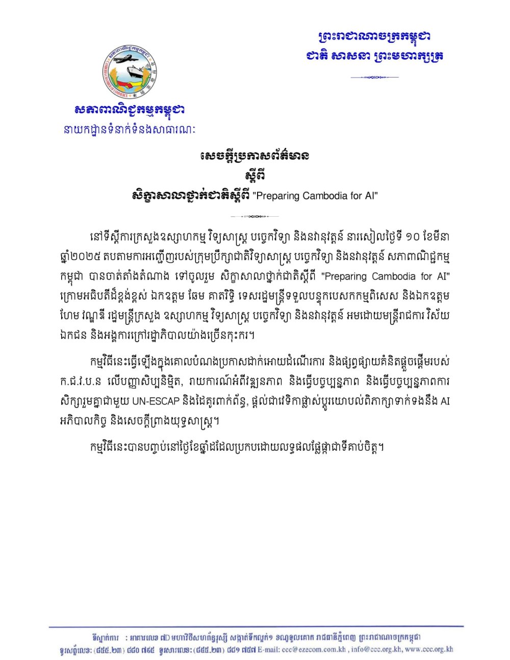 នៅទីស្តីការក្រសួងឧស្សាហកម្ម វិទ្យសាស្រ្ត បច្ចេកវិទ្យា និងនវានុវត្តន៍ នារសៀលថ្ងៃទី ១០ ខែមីនា ឆ្នាំ២០២៥ តបតាមការអញ្ជើញរបស់ក្រុមប្រឹក្សាជាតិវិទ្យាសាស្ត្រ បច្ចេកវិទ្យា និងនវានុវត្តន៍ សភាពាណិជ្ជកម្មកម្ពុជា បានចាត់តាំងតំណាង ទៅចូលរួម សិក្ខាសាលាថ្នាក់ជាតិស្តីពី “Preparing Cambodia for AI​“ ក្រោមអធិបតីដ៏ខ្ពង់ខ្ពស់ ឯកឧត្តម ឆែម គាតរិទ្ធិ ទេសរដ្ឋមន្រ្តីទទួលបន្ទុកបេសកកម្មពិសេស និងឯកឧត្តម ហែម វណ្ឌឌី រដ្ឋមន្ត្រីក្រសួង ឧស្សាហកម្ម វិទ្យសាស្រ្ត បច្ចេកវិទ្យា និងនវានុវត្តន៍ អមដោយមន្ត្រីរាជការ វិស័យឯកជន និងអង្គការក្រៅរដ្ឋាភិបាលយ៉ាងច្រើនកុះករ។