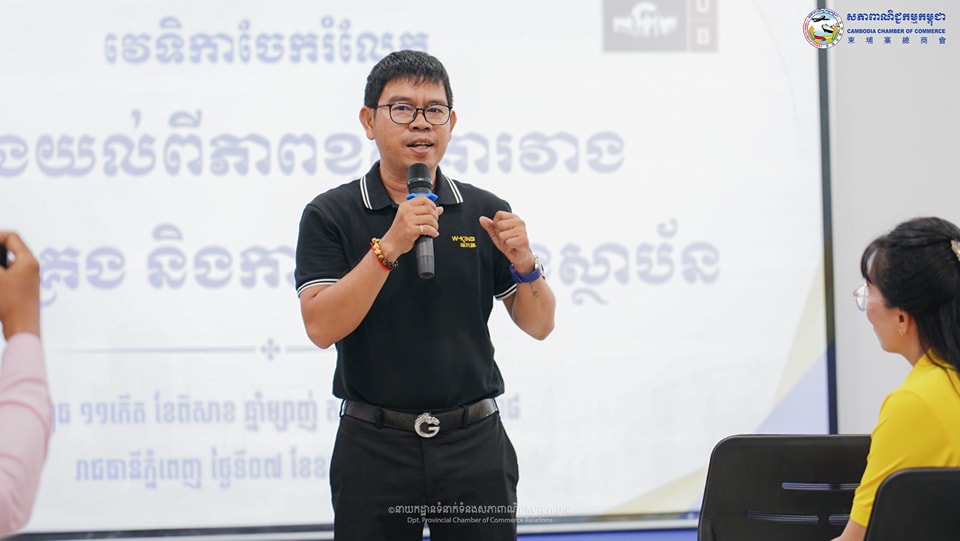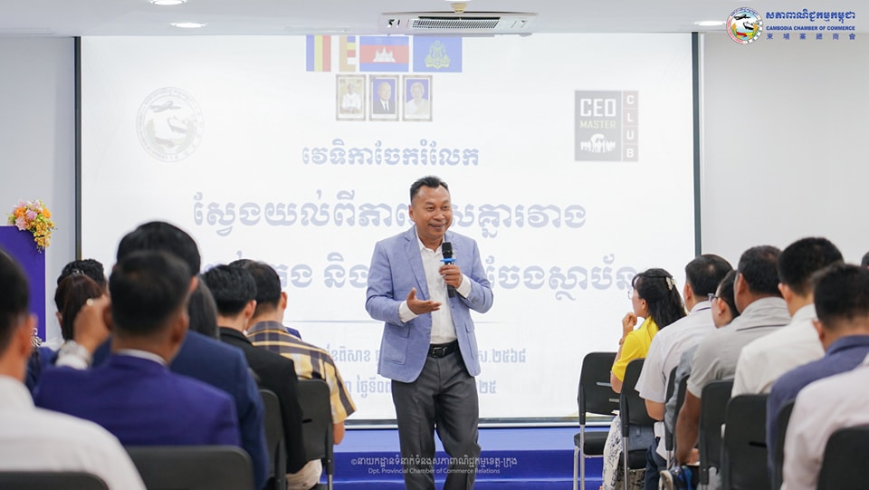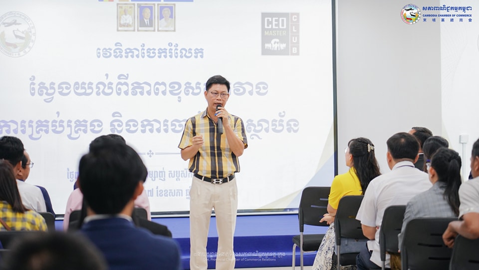 រាជធានីភ្នំពេញ៖ នារសៀលថ្ងៃពុធ ទី០៧ ខែឧសភា ឆ្នាំ២០២៥ សភាពាណិជ្ជកម្មកម្ពុជា សហការជាមួយ CEO Master Club បានរៀបចំវេទិកាចែករំលែកចំណេះដឹងស្ដីពី “ស្វែងយល់ពីភាពខុសគ្នារវាងការគ្រប់គ្រង និងការចាត់ចែងស្ថាប័ន” ជូនដល់សមាជិក សមាជិកា និងអ្នកចូលរួមប្រមាណ ១០០ នាក់ នៅសភាពាណិជ្ជកម្មកម្ពុជា។