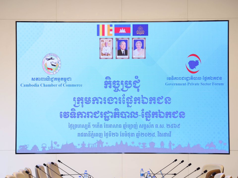 នៅព្រឹកថ្ងៃព្រហស្បតិ៍ ០១កើត ខែអាសាឍ ឆ្នាំម្សាញ់ សប្តស័ក ព.ស ២៥៦៩ ត្រូវនឹងថ្ងៃទី២៦ ខែមិថុនា ឆ្នាំ២០២៥ វេលាម៉ោង ០៨:០០នាទី នៅអាគារវីងថោវីរ មានរៀបចំកិច្ចប្រជុំក្រុមការងារផ្នែកឯកជន នៃវេទិការាជរដ្ឋាភិបាល-ផ្នែកឯកជន ក្រោមអធីបតីដឹកនាំដ៏ខ្ពង់ខ្ពស់របស់ អ្នកឧកញ៉ា គិត ម៉េង ប្រធានសភាពាណិជ្ជកម្មកម្ពុជា និងជាប្រធានគណៈកម្មការសម្របសម្រួលក្រុមការងារផ្នែកឯកជន សម្រាប់យន្តការវេទិការាជរដ្ឋាភិបាល-ផ្នែកឯកជន (គ.ស.ឯ.រ.ជ)។កិច្ចប្រជុំនេះក៏មានការចូលរួមផងដែរពីសំណាក់ លោកអ្នកឧកញ៉ា អ្នកឧកញ៉ា ឧកញ៉ា ឯកឧត្តម លោកជំទាវ អស់លោកដែលជាសហប្រធានក្រុមការងារទាំង១៦ ផ្នែកឯកជន ដែលតំណាងឱ្យ ១៦ វិស័យផ្សេងៗគ្នា។