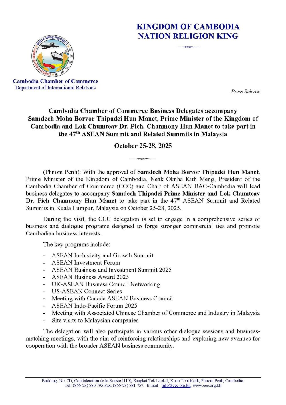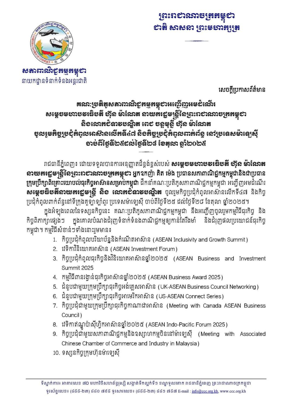 រាជធានីភ្នំពេញ៖ ដោយទទួលបានការអនុញ្ញាតដ៏ខ្ពង់ខ្ពស់របស់ សម្តេចមហាបវរធិបតី ហ៊ុន ម៉ាណែត នាយករដ្ឋមន្ត្រីនៃព្រះរាជាណាចក្រកម្ពុជា អ្នកឧកញ៉ា គិត ម៉េង ប្រធានសភាពាណិជ្ជកម្មកម្ពុជានិងជាប្រធានក្រុមប្រឹក្សាពិគ្រោះយោបល់ធុរកិច្ចអាស៊ានសម្រាប់កម្ពុជា ដឹកនាំគណៈប្រតិភូសភាពាណិជ្ជកម្មកម្ពុជា អញ្ជើញអមដំណើរ សម្តេចធិបតីនាយករដ្ឋមន្ត្រី និង លោកជំទាវបណ្ឌិត ចូលរួមកិច្ចប្រជុំកំពូលអាស៊ានលើកទី៤៧ និងកិច្ចប្រជុំកំពូលពាក់ព័ន្ធនៅទីក្រុងគួឡាឡាំពួរ ប្រទេសម៉ាឡេស៊ី ចាប់ពីថ្ងៃទី២៥ ដល់ថ្ងៃទី២៨ ខែតុលា ឆ្នាំ២០២៥។