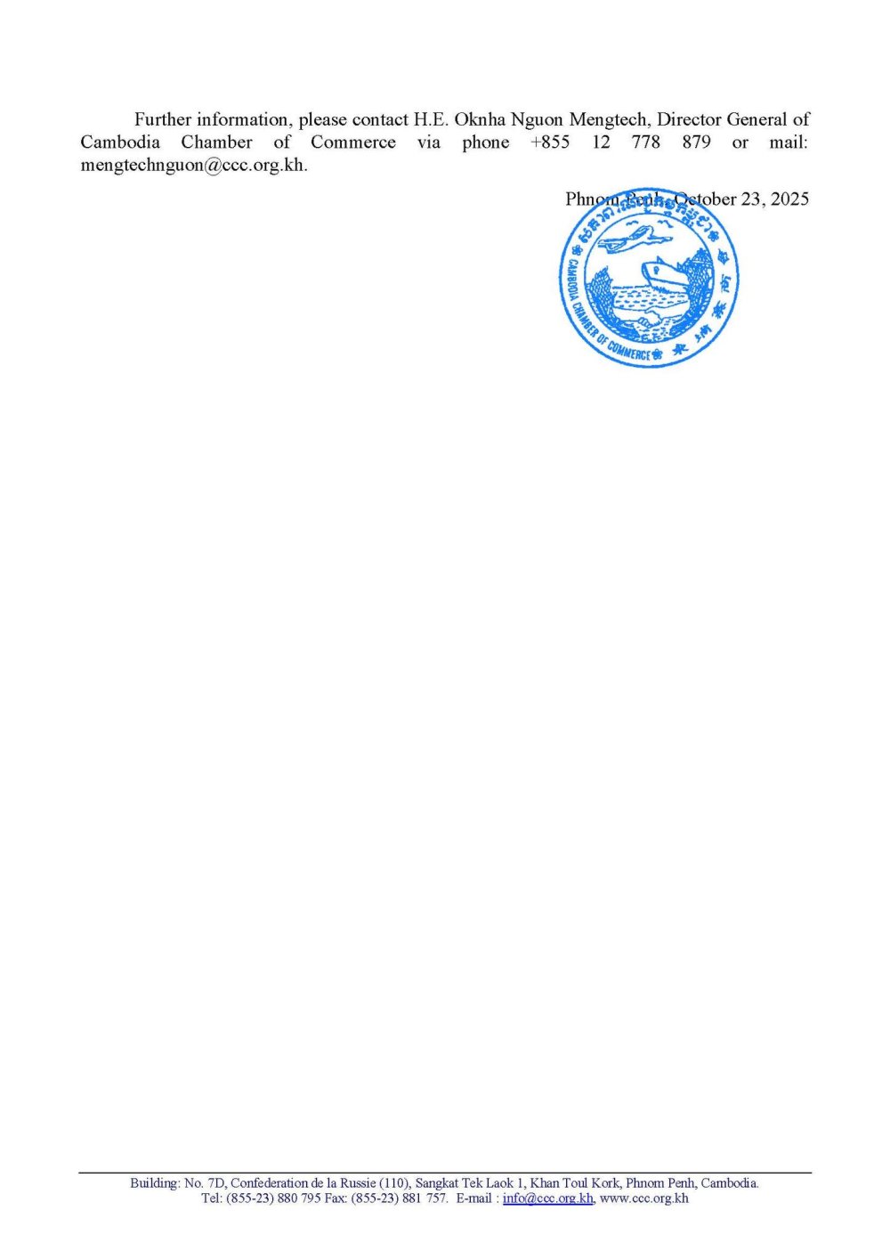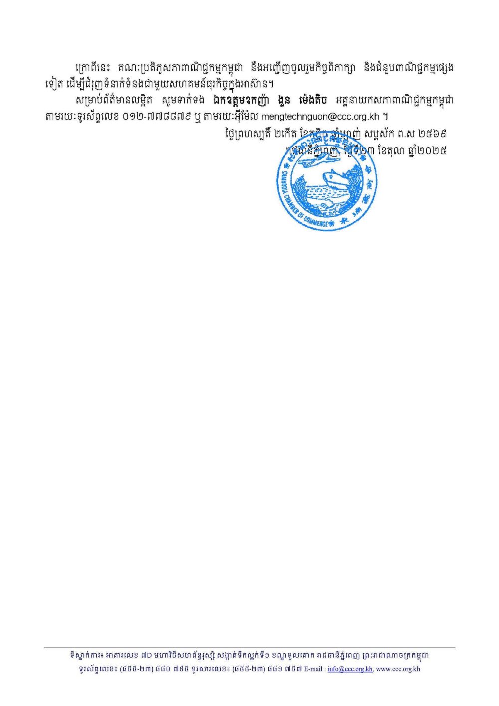 ក្រោពីនេះ គណៈប្រតិភូសភាពាណិជ្ជកម្មកម្ពុជា នឹងអញ្ជើញចូលរួមកិច្ចពិភាក្សា និងជំនួបពាណិជ្ជកម្មផ្សេងទៀត ដើម្បីជំរុញទំនាក់ទំនងជាមួយសហគមន៍ធុរកិច្ចក្នុងអាស៊ាន។