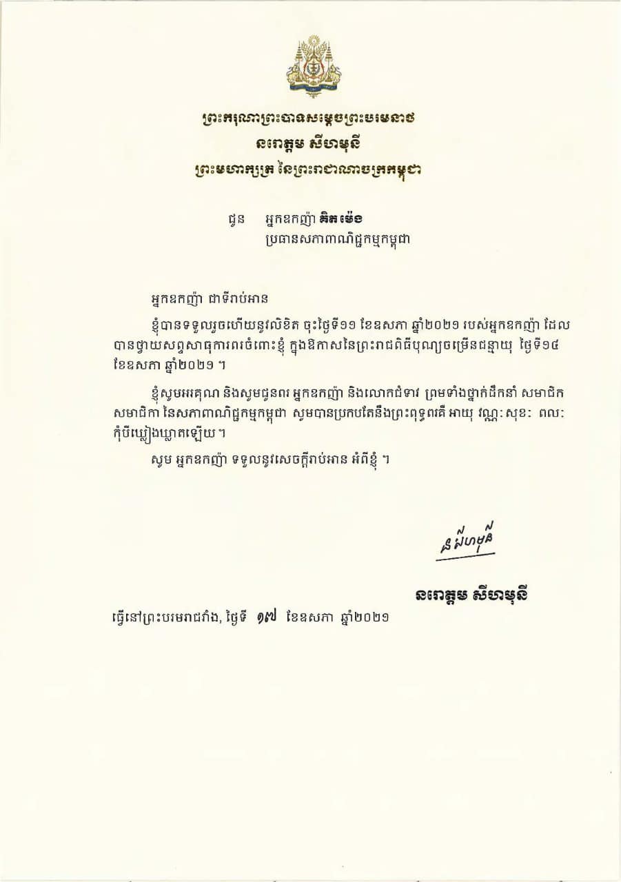 ព្រះរាជលិខិត ព្រះករុណាព្រះបាទសម្តេចព្រះបរមនាថ នរោត្តម សីហមុនី ព្រះមហាក្សត្រ នៃព្រះរាជាណាចក្រកម្ពុជា ជាទីគោរពសក្ការៈដ៏ខ្ពង់ខ្ពស់បំផុត ជូនចំពោះ អ្នកឧកញ៉ា គិត ម៉េង ប្រធានសភាពាណិជ្ជកម្មកម្ពុជា និង លោកជំទាវ ព្រមទាំងថ្នាក់ដឹកនាំ សមាជិក សមាជិកា នៃសភាពាណិជ្ជកម្មកម្ពុជា។