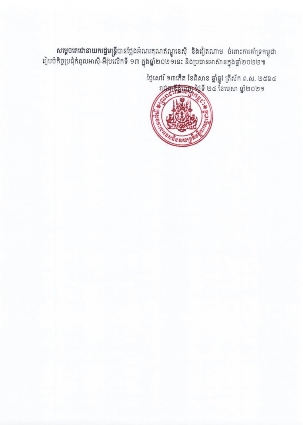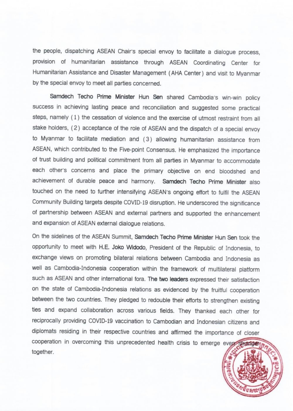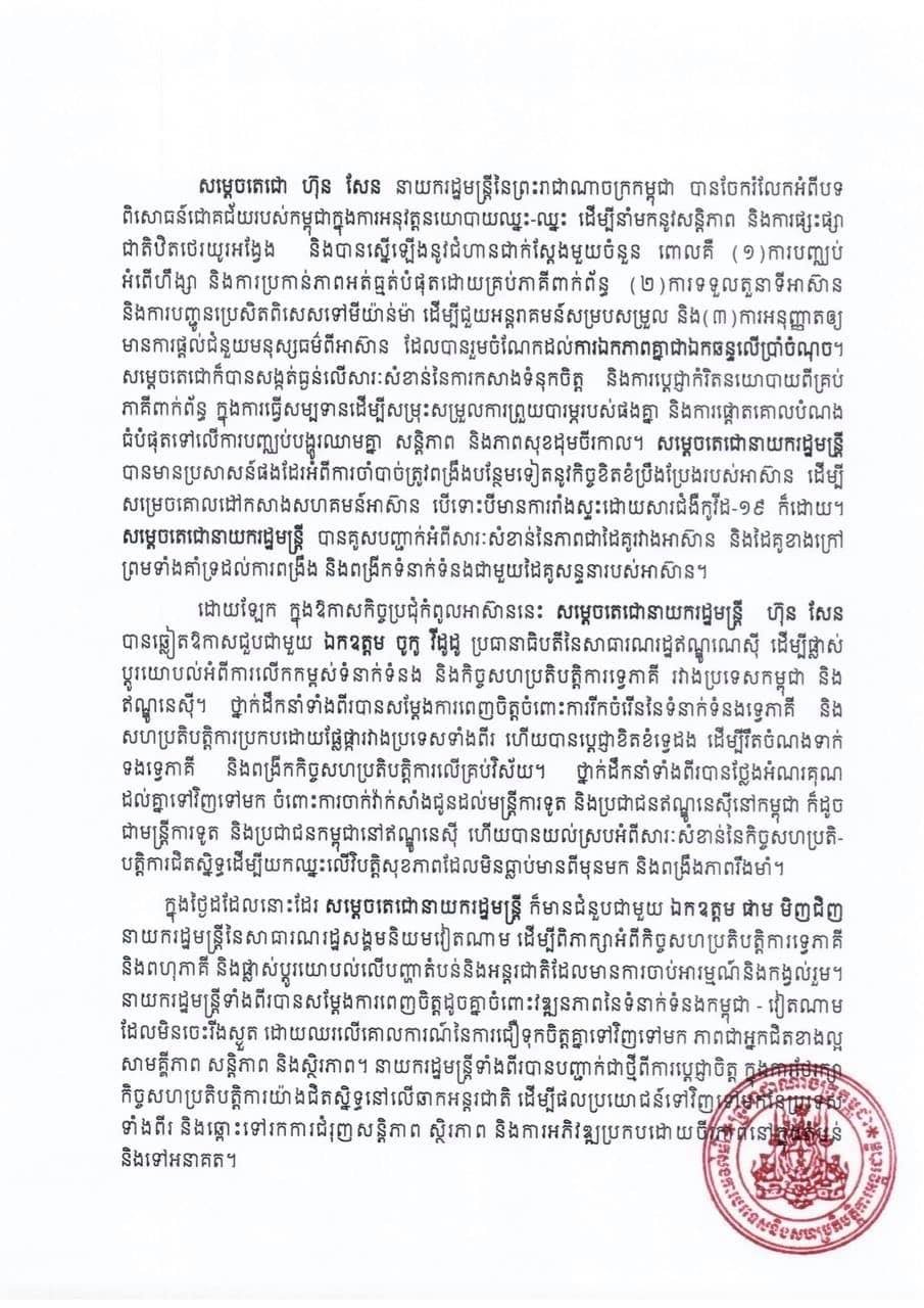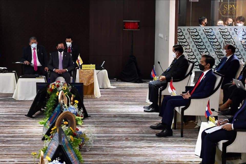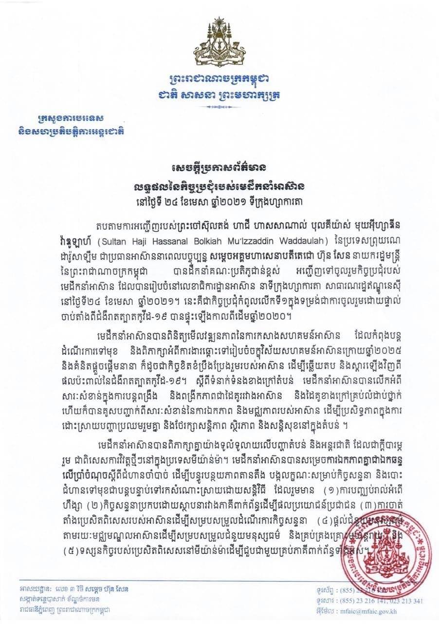 សេចក្តីប្រកាសព័ត៌មាន ស្តីពីលទ្ធផលនៃកិច្ចប្រជុំរបស់មេដឹកនាំអាស៊ាន នៅថ្ងៃទី ២៤ ខែមេសា ឆ្នាំ២០២១ ទីក្រុងហ្សាការតា។
