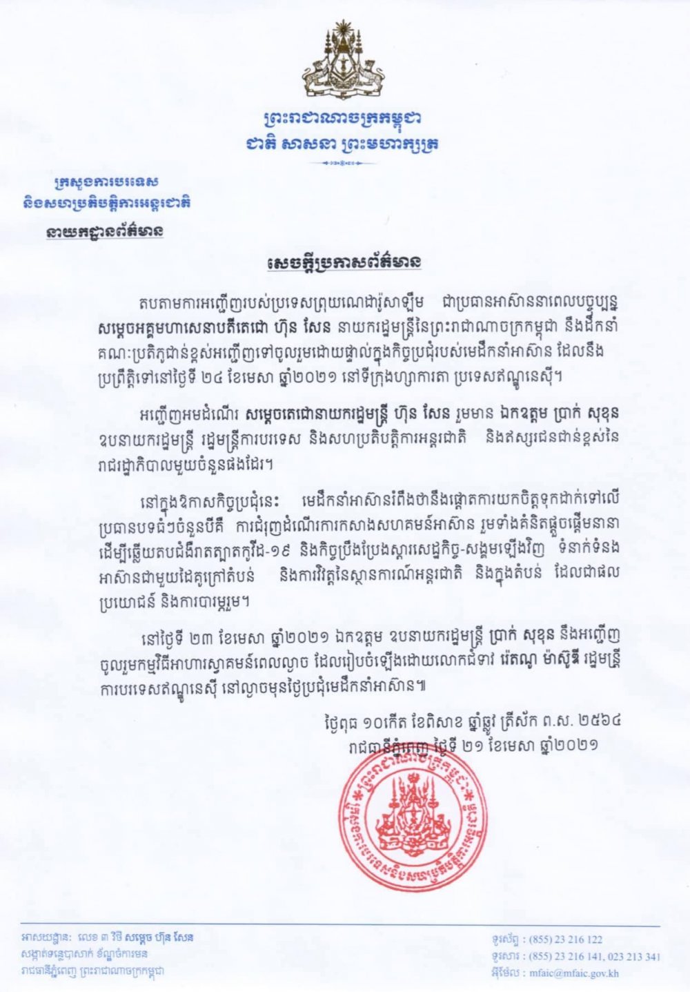 Press Release on Samdech Akka Moha Sena Padei Techo HUN SEN, Prime Minister of the Kingdom of Cambodia, will lead a delegation to attend the ASEAN Leaders’ Meeting which will be convened in a physical format on 24 April 2021 in Jakarta, Indonesia.