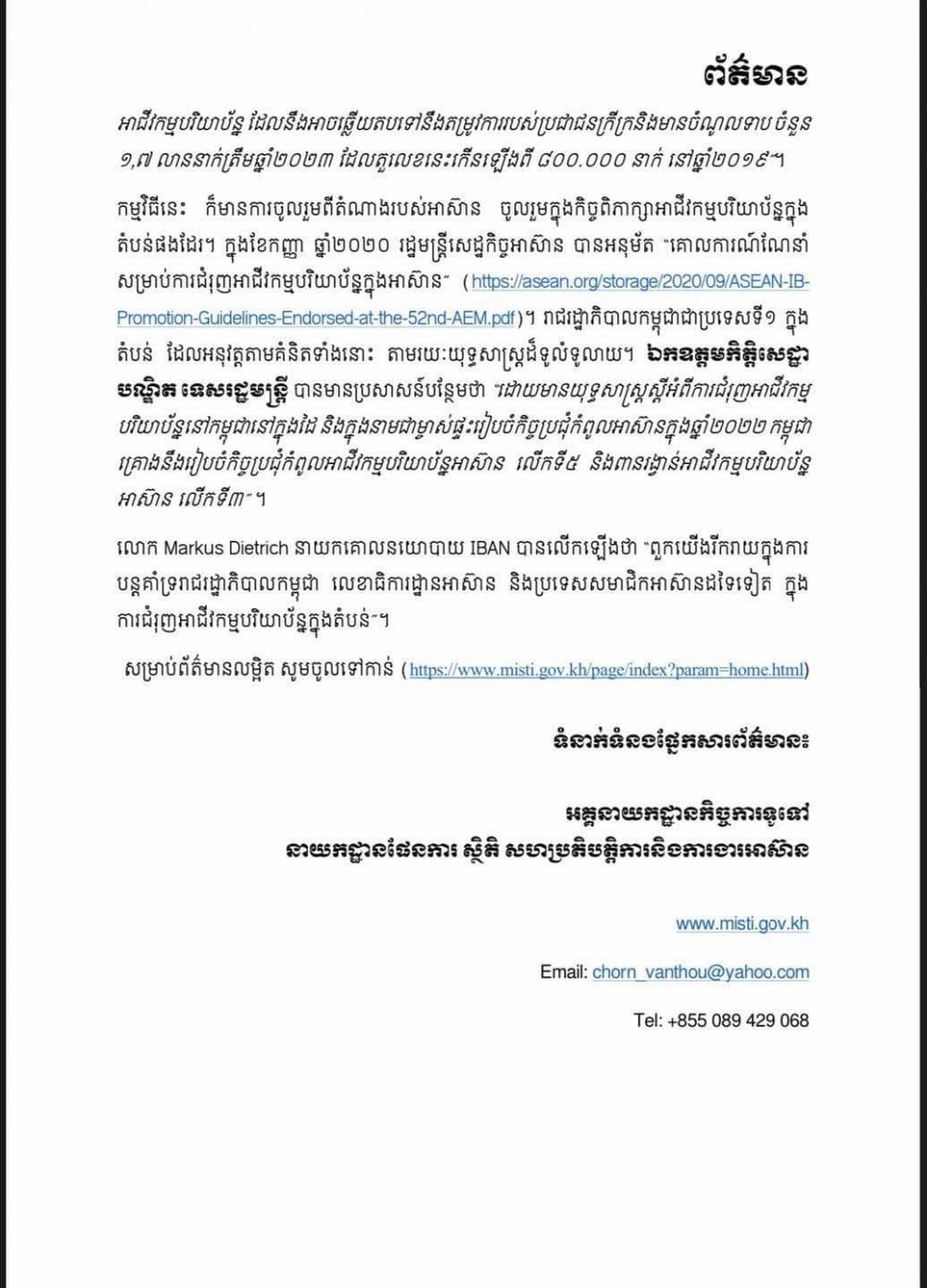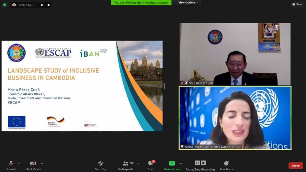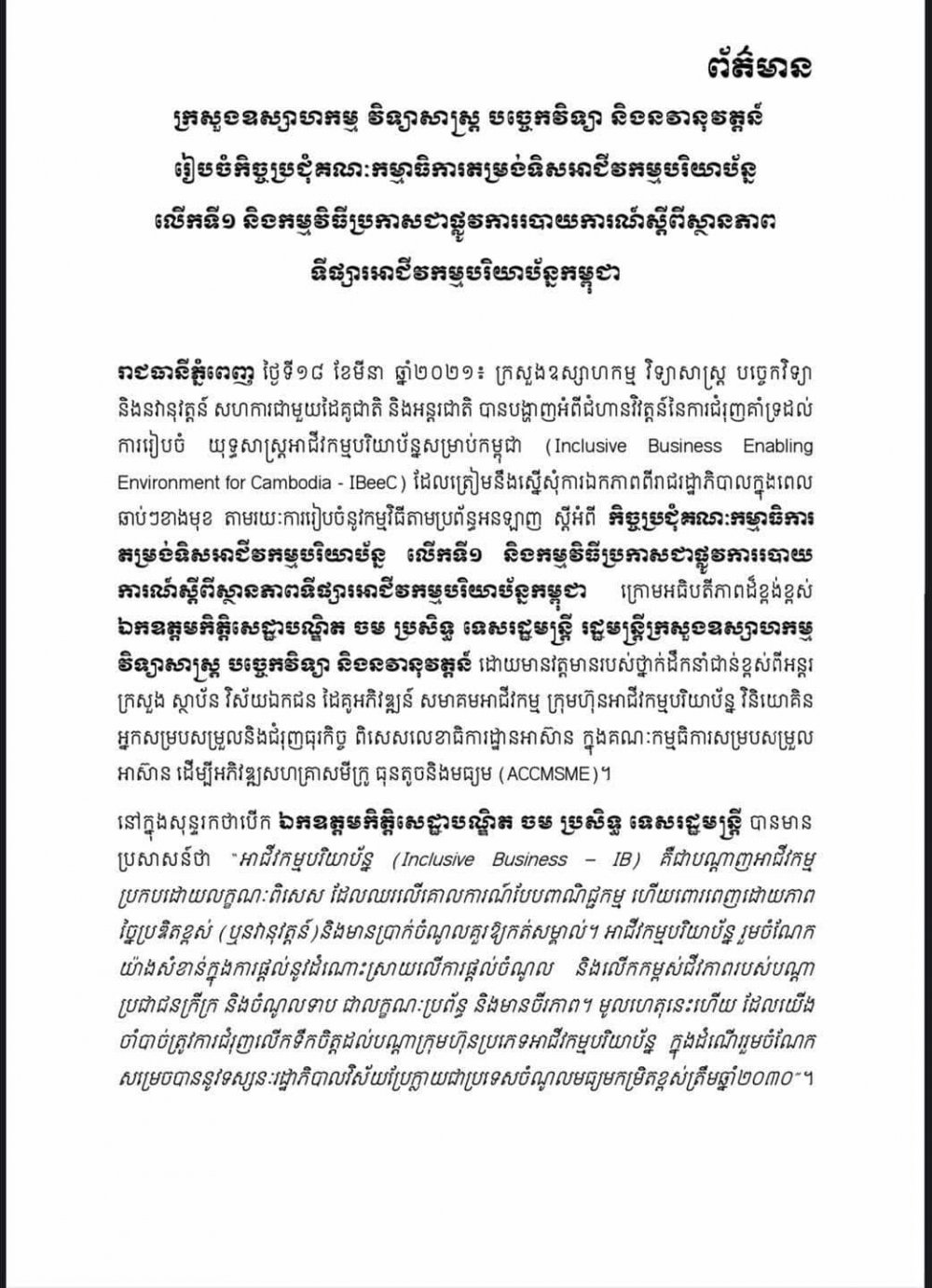 On Thursday March 18, 2021, H.E Meng Nimol, Deputy Director General of Cambodia Chamber of Commerce, representing H.E Okhna Ngoun Mengtech, Director General of Cambodia Chamber of Commerce attended “The Launching of Inclusive Business Landscape Study Report & the 1st Inclusive Business Champions Meeting for Cambodia” virtually. The event was presided over by H.E Kitti Setha Pandita Cham Prasidh, Senior Minister, Minister of Industry, Science, Technology and Innovation.