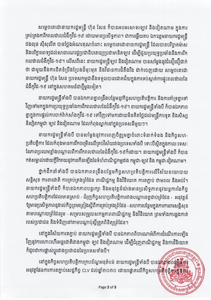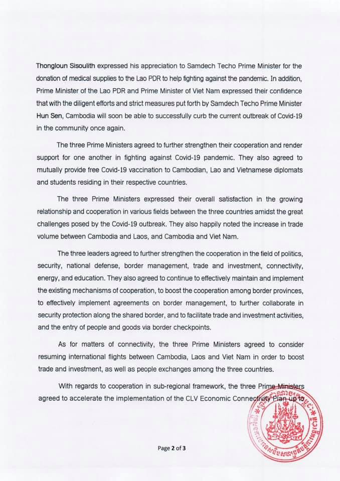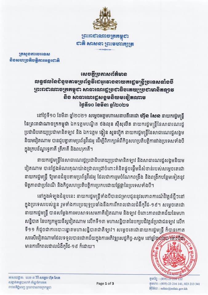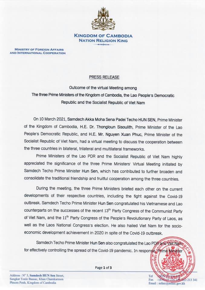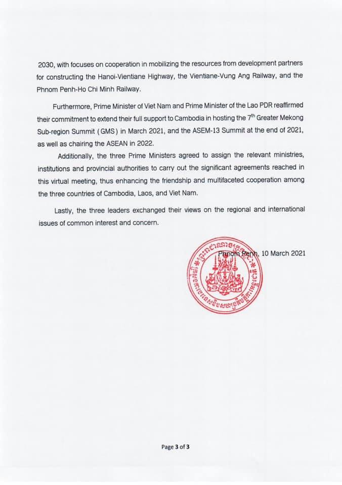 Outcome of the Virtual Meeting among the three Prime Ministers of the Kingdom of Cambodia, the Lao People’s Democratic Republic and the Socialist Republic of Viet Nam, on 10 March 2021.