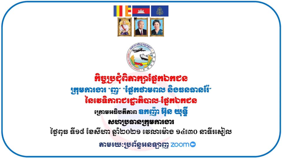ថ្ងៃពុធ ១០កើត ខែស្រាពណ៍ ឆ្នាំឆ្លូវ ត្រីស័ក ព.ស ២៥៦៥ ត្រូវនឹងថ្ងៃទី១៨ ខែសីហា ឆ្នាំ២០២១ វេលាម៉ោង ០២:៣០ នាទីរសៀល មានរៀបចំកិច្ចប្រជុំពិភាក្សាក្រុមការងារ “ញ” “ផ្នែកធនធានរ៉ែ និងថាមពល” ផ្នែកឯកជន នៃវេទិការាជរដ្ឋាភិបាល-ផ្នែកឯកជន តាមប្រព័ន្ធវីដេអូអនឡាញ (zoom) ក្រោមអធិបតីភាព ឧកញ៉ា អ៊ុន យុទ្ធី សហប្រធានក្រុមការងារ “ញ” ផ្នែកឯកជន ព្រមទាំងវត្តមានចូលរួមពី ឧកញ៉ា លោក លោកស្រី អនុសហប្រធាន និងសមាជិកសមាជិកានៃក្រុមការងារ។ កិច្ចប្រជុំនេះ ក៏មានការចូលរួមផងដែរពីសំណាក់ ឧកញ៉ា លឹម ហេង អនុប្រធានសភាពាណិជ្ជកម្មកម្ពុជា និងជាអ្នកសម្របសម្រួលក្រុមការងារទាំង១៣ ផ្នែកឯកជន និងវត្តមាន ឯកឧត្តម ឧកញ៉ា ងួន ម៉េងតិច អគ្គនាយកសភាពាណិជ្ជកម្មកម្ពុជា និងសមាជិក សមាជិកាសភាពាណិជ្ជកម្មកម្ពុជា, តំណាងសមាគមថ្មក្រានីតកម្ពុជា, តំណាងសមាគមអគ្គិសនីជនបទ, ក្រុមហ៊ុនឯកជន, និងសមាជិក សមាជិកានៃក្រុមការងារ “ញ”ជាច្រើនទៀតផងដែរ។