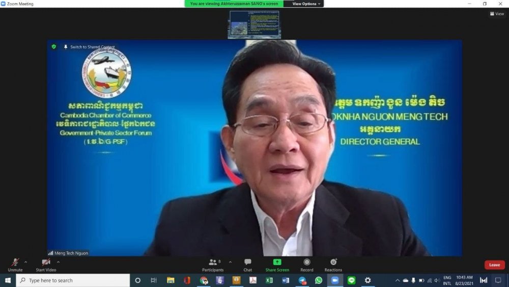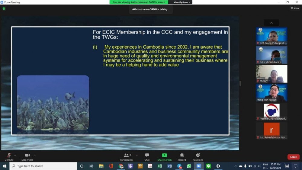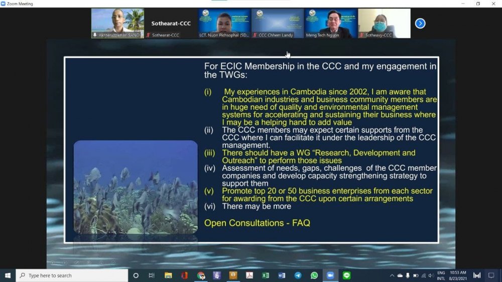 នាថ្ងៃចន្ទ ១៥កើត ខែស្រាពណ៍ ឆ្នាំឆ្លូវ ត្រីស័ក ព.ស. ២៥៦៥ ត្រូវនឹងថ្ងៃទី២៣ ខែសីហា ឆ្នាំ២០២១ វេលាម៉ោង ១០៖៣០នាទីព្រឹក ឯកឧត្តម ឧកញ៉ា ងួន ម៉េងតិច អគ្គនាយកសភាពាណិជ្ជកម្មកម្ពុជា បានទទួលជំនួបសសម្តែងការគួរសម ពីលោក អាត់ធ័ររ៉ូហ្សាម៉ែន សាណូ (Mr.Akhteruzzaman Sano) ប្រធានក្រុមហ៊ុន Environmental Consulting International (E C I C) Co., Ltd. តាមរយៈប្រព័ន្ធអនឡាញ (Zoom Meeting)។