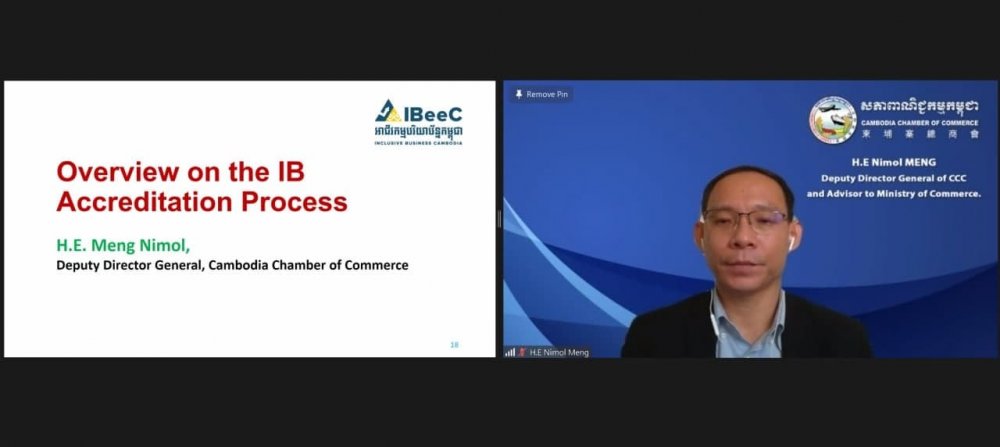On Thursday Afternoon of October 21, 2021 H.E Meng Nimol, Deputy Director General of Cambodia Chamber of Commerce and the member of the Inclusive Business (IB) Accreditation Committee attended the 2nd Inclusive Business Stakeholder Meeting and delivered remarks on the “Overview on the IB Accreditation Process” during the 1st IB Award Ceremony via virtual platform. The event was presided over by H.E Dr. Heng Sokkung, Secretary of State of Ministry of Industry, Science, Technology and Innovation representing H.E Kitti Settha Pandita Cham Prasidh, Senior Minister, Minister of Industry, Science, Technology and Innovation with participation from provincial department of Industry, Science, Technology and Innovation, representative from line ministries and business associations in Cambodia.