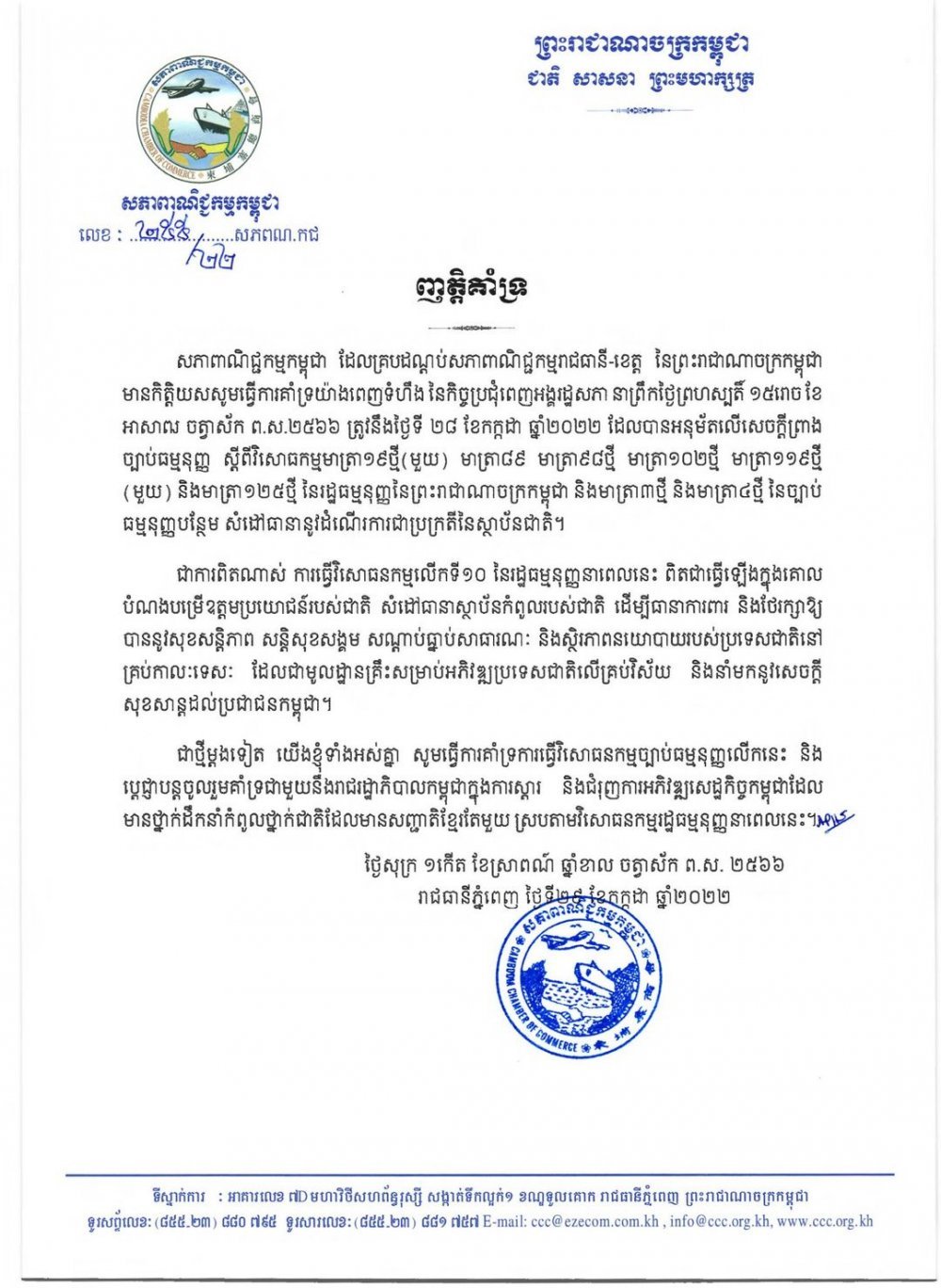 សភាពាណិជ្ជកម្មកម្ពុជា ដែលគ្របដណ្តប់សភាពាណិជ្ជកម្មរាជធានី-ខេត្ត នៃព្រះរាជាណាចក្រកម្ពុជា មានកិត្តិយសសូមធ្វើការគាំទ្រយ៉ាងពេញទំហឹង នៃកិច្ចប្រជុំពេញអង្គរដ្ឋសភា នាព្រឹកថ្ងៃព្រហស្បតិ៍ ១៥រោច ខែអាសាឍ ចត្វាស័ក ព.ស.២៥៦៦ ត្រូវនឹងថ្ងៃទី ២៨ ខែកក្កដា ឆ្នាំ២០២២ ដែលបានអនុម័តលើសេចក្តីព្រាងច្បាប់ធម្មនុញ្ញ ស្តីពីវិសោធកម្មមាត្រា១៩ថ្មី(មួយ) មាត្រា៨៩ មាត្រា៩៨ថ្មី មាត្រា១០២ថ្មី មាត្រា១១៩ថ្មី(មួយ) និងមាត្រា១២៥ថ្មី នៃរដ្ឋធម្មនុញ្ញនៃព្រះរាជាណាចក្រកម្ពុជា និងមាត្រា៣ថ្មី និងមាត្រា៤ថ្មី នៃច្បាប់ធម្មនុញ្ញបន្ថែម សំដៅធានានូវដំណើរការជាប្រក្រតីនៃស្ថាប័នជាតិ។