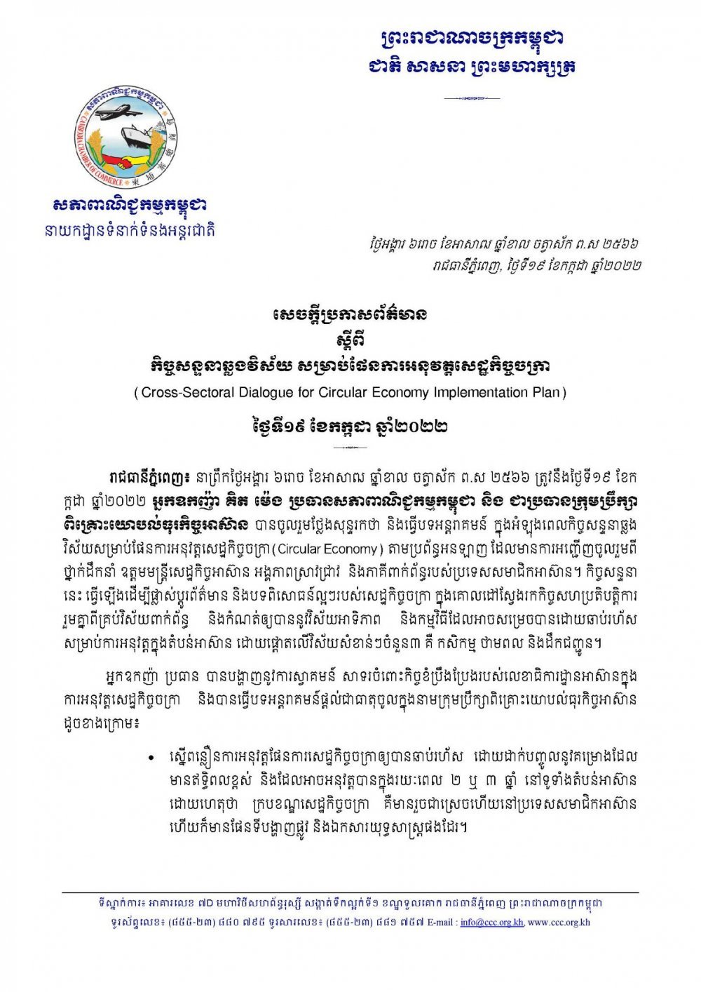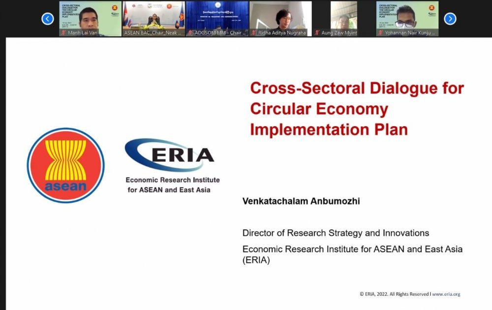 វិស័យសម្រាប់ផែនការអនុវត្តសេដ្ឋកិច្ចចក្រា(Circular Economy) តាមប្រព័ន្ធអនឡាញ ដែលមានការអញ្ជើញចូលរួមពីថ្នាក់ដឹកនាំ ឧត្តមមន្ត្រីសេដ្ឋកិច្ចអាស៊ាន អង្គភាពស្រាវជ្រាវ និងភាគីពាក់ព័ន្ធរបស់ប្រទេសសមាជិកអាស៊ាន។ កិច្ចសន្ទនានេះ ធ្វើឡើងដើម្បីផ្លាស់ប្តូរព័ត៌មាន និងបទពិសោធន៍ល្អៗរបស់សេដ្ឋកិច្ចចក្រា ក្នុងគោលដៅស្វែងរកកិច្ចសហប្រតិបត្តិការរួមគ្នាពីគ្រប់វិស័យពាក់ព័ន្ធ និងកំណត់ឲ្យបាននូវវិស័យអាទិភាព និងកម្មវិធីដែលអាចសម្រេចបានដោយឆាប់រហ័ស សម្រាប់ការអនុវត្តក្នុងតំបន់អាស៊ាន ដោយផ្តោតលើវិស័យសំខាន់ៗចំនួន៣ គឺ កសិកម្ម ថាមពល និងដឹកជញ្ជូន។