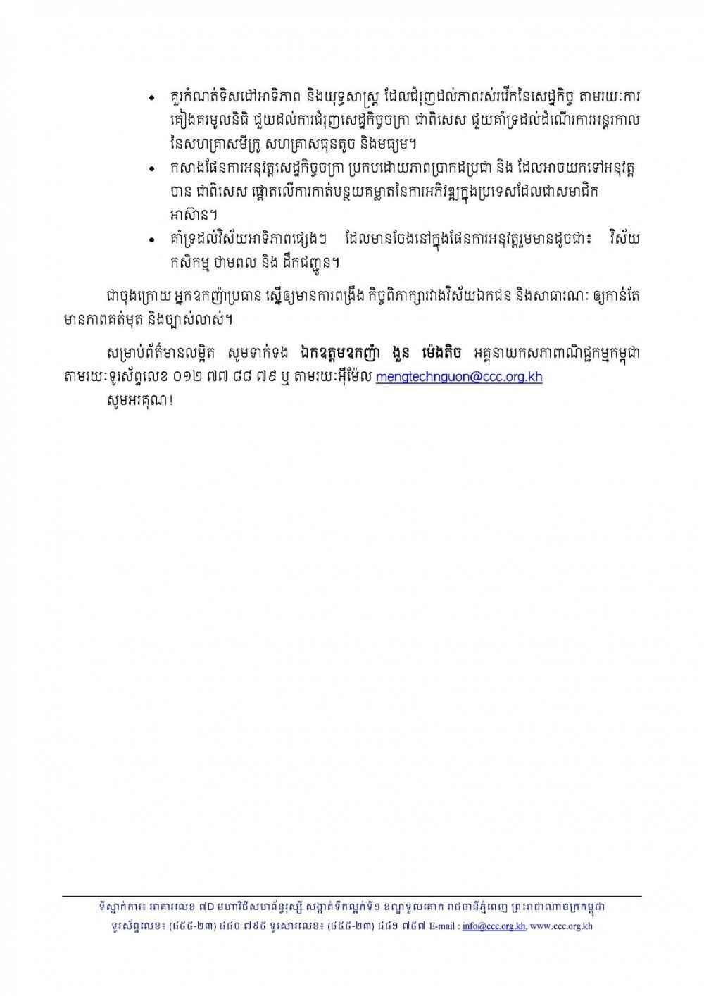 ជាចុងក្រោយ អ្នកឧកញ៉ាប្រធាន ស្នើឲ្យមានការពង្រឹង កិច្ចពិភាក្សារវាងវិស័យឯកជន និងសាធារណៈ ឲ្យកាន់តែមានភាពគត់មុត និងច្បាស់លាស់។