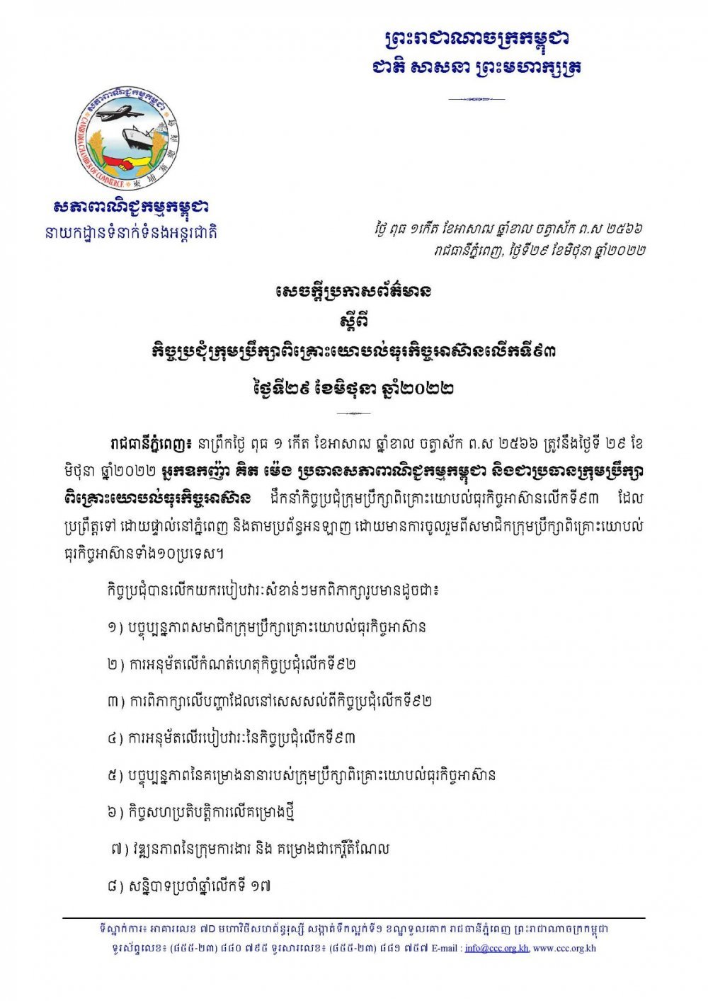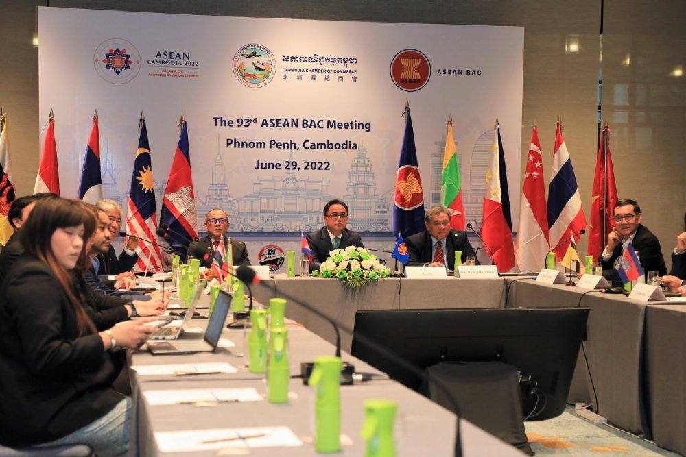 រាជធានីភ្នំពេញ៖ នាព្រឹកថ្ងៃ ពុធ ១ កើត ខែអាសាឍ ឆ្នាំខាល ចត្វាស័ក ព.ស ២៥៦៦ ត្រូវនឹងថ្ងៃទី ២៩ ខែ មិថុនា ឆ្នាំ២០២២ អ្នកឧកញ៉ា គិត ម៉េង ប្រធានសភាពាណិជ្ជកម្មកម្ពុជា និងជាប្រធានក្រុមប្រឹក្សាពិគ្រោះយោបល់ធុរកិច្ចអាស៊ាន ដឹកនាំកិច្ចប្រជុំក្រុមប្រឹក្សាពិគ្រោះយោបល់ធុរកិច្ចអាស៊ានលើកទី៩៣ ដែលប្រព្រឹត្តទៅ ដោយផ្ទាល់នៅភ្នំពេញ និងតាមប្រព័ន្ធអនឡាញ ដោយមានការចូលរួមពីសមាជិកក្រុមប្រឹក្សាពិគ្រោះយោបល់ធុរកិច្ចអាស៊ានទាំង១០ប្រទេស។