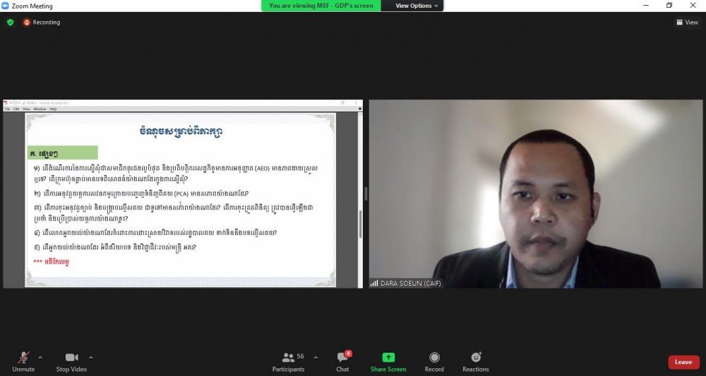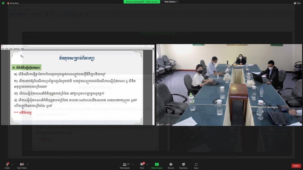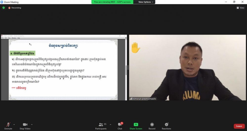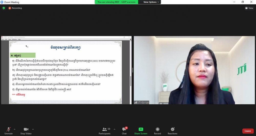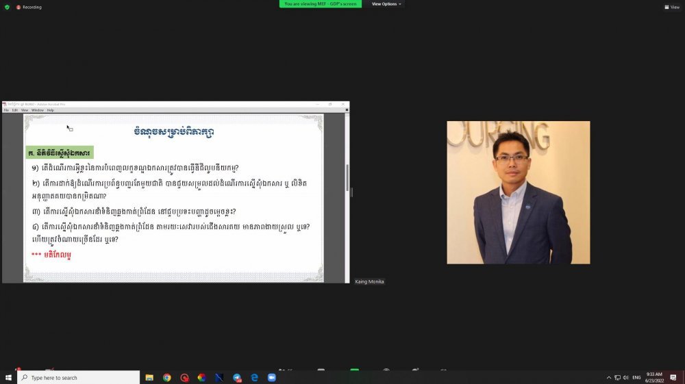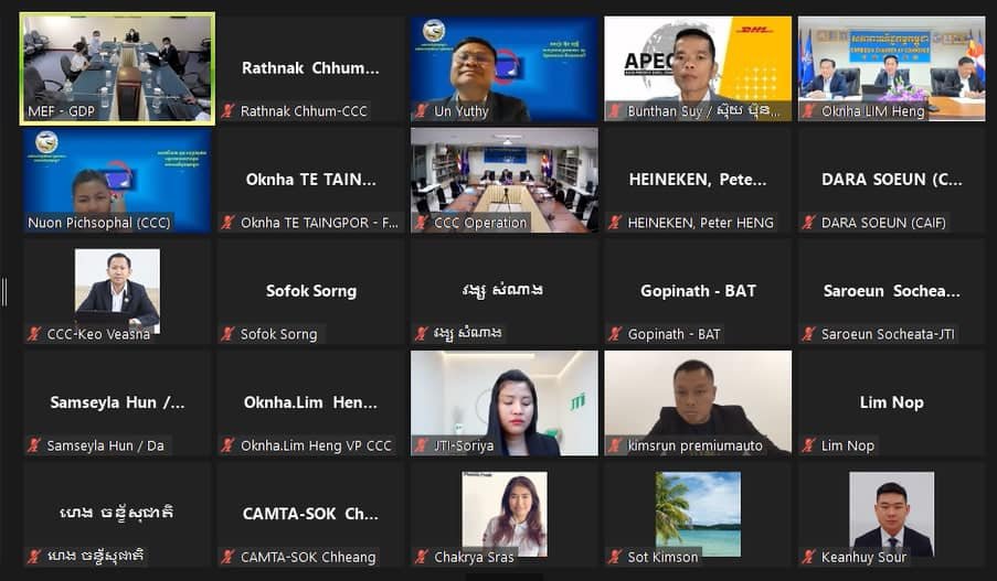 ថ្ងៃព្រហស្បតិ៍ ០៩រោច ខែជេស្ឋ ឆ្នាំខាល ចត្វាស័ក ព.ស ២៥៦៦ ត្រូវនឹងថ្ងៃទី២៣ ខែមិថុនា ឆ្នាំ២០២២ វេលាម៉ោង ០៩:០០នាទីព្រឹក ឧកញ៉ា លឹម ហេង អនុប្រធានសភាពាណិជ្ជកម្មកម្ពុជា តំណាង អ្នកឧកញ៉ា គិត ម៉េង ប្រធានសភាពាណិជ្ជកម្មកម្ពុជាបានដឹកនាំសមាជិក ព្រមទាំង ឧកញ៉ា គួច ផេង អនុប្រធានសភាពាណិជ្ជកម្មកម្ពុជា, ឯកឧត្តម ឧកញ៉ា ងួន ម៉េង តិច អគ្គនាយកសភាពាណិជ្ជលម្មកម្ពុជា នឹងសមាជិកាសភាពាណិជ្ជកម្មកម្ពុជា ចូលរួមក្នុងកិច្ចប្រជុំពិគ្រោះយោបល់ស្តីពីវឌ្ឍនភាព, បញ្ហាប្រឈម និងទិសដៅនៃផ្តល់សេវារបស់អគ្គនាយកដ្ឋានគយ និងរដ្ឋាករកម្ពុជា ដែលរៀបចំដោយ អគ្គនាយកដ្ឋានគោលនយោបាយ នៃក្រសួងសេដ្ឋកិច្ច និងហិរញ្ញវត្ថុ តាមប្រព័ន្ធអនឡាញ ZOOM ក្រោមអធិបតីភាព លោកជំទាវ គ្រុយ ណារិន អគ្គនាយករង នៃអគ្គនាយកដ្ឋានគោលនយោបាយ នៃក្រសួងសេដ្ឋកិច្ច និងហិរញ្ញវត្ថុ។ កិច្ចប្រជុំនេះក៏មានការចូលរួមផងដែរពីសំណាក់មន្ត្រីពាក់ព័ន្ធនៃអគ្គនាយកដ្ឋានគោលនយោបាយ នៃក្រសួងសេដ្ឋកិច្ច និងហិរញ្ញវត្ថុ, តំណាងសភាពាណិជ្ជកម្មអឺរ៉ុប, តំណាងសហព័ន្ធឧស្សាហកម្មយានយន្តកម្ពុជា, តំណាងសហព័ន្ធសមាគមសហគ្រាសធុនតូច និងមធ្យមនៅកម្ពុជា, តំណាងសមាគមពាណិជ្ជកម្មជប៉ុន, និងក្រុមហ៊ុនឯកជនជាច្រើនទៀតផងដែរ។