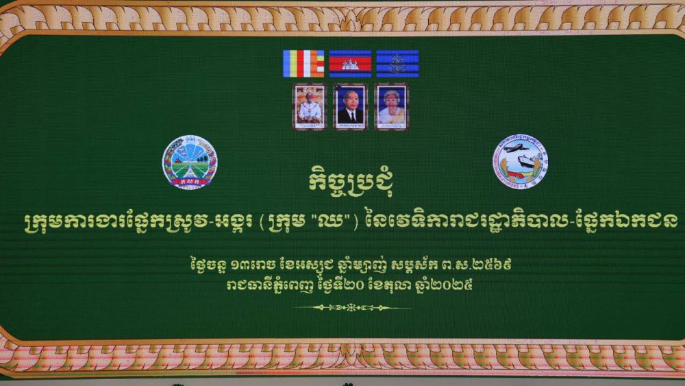 ភ្នំពេញ៖ នៅរសៀលថ្ងៃចន្ទ ទី២០ ខែតុលា ឆ្នាំ២០២៥ វេលាម៉ោង ០២:៣០នាទី នៅទីស្តីការក្រសួងកសិកម្ម រុក្ខាប្រមាញ់ និងនេសាទ មានរៀបចំកិច្ចប្រជុំក្រុមការងារ "ឈ" "ផ្នែកស្រូវ-អង្ករ" នៃវេទិការាជរដ្ឋាភិបាល-ផ្នែកឯកជន ក្រោមអធីបតីភាពដឹកនាំដោយសហប្រធាននៃក្រុមការងារទាំងពីរគឺ ឯកឧត្តម ឌិត ទីណា រដ្ឋមន្ត្រីក្រសួងកសិកម្ម រុក្ខាប្រមាញ់ និងនេសាទ និងជាសហប្រធានក្រុមការងារ "ឈ" តំណាងផ្នែករដ្ឋាភិបាល និង ឧកញ៉ា ចាន់ សុឃាំង សហប្រធានក្រុមការងារ "ឈ" តំណាងផ្នែកឯកជន។ ចូលរួមក្នុងកិច្ចប្រជុំនេះក៏មានផងដែរពីសំណាក់តំណាងក្រសួង ស្ថាប័នពាក់ព័ន្ធដែលជាសមាជិកនៃក្រុមការងារតំណាងផ្នែករដ្ឋាភិបាល និងតំណាងសមាគម ក្រុមហ៊ុនឯកជន រោងម៉ាស៊ុីនកិនស្រូវដែលជាសមាជិកនៃក្រុមការងារផ្នែកឯក និងអ្នកពាក់ព័ន្ធក្នុងវិស័យស្រូវ អង្ករជាច្រើនទៀតផងដែរ។