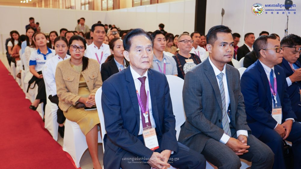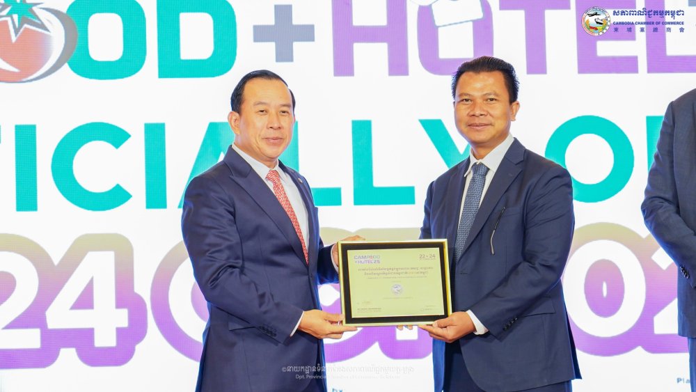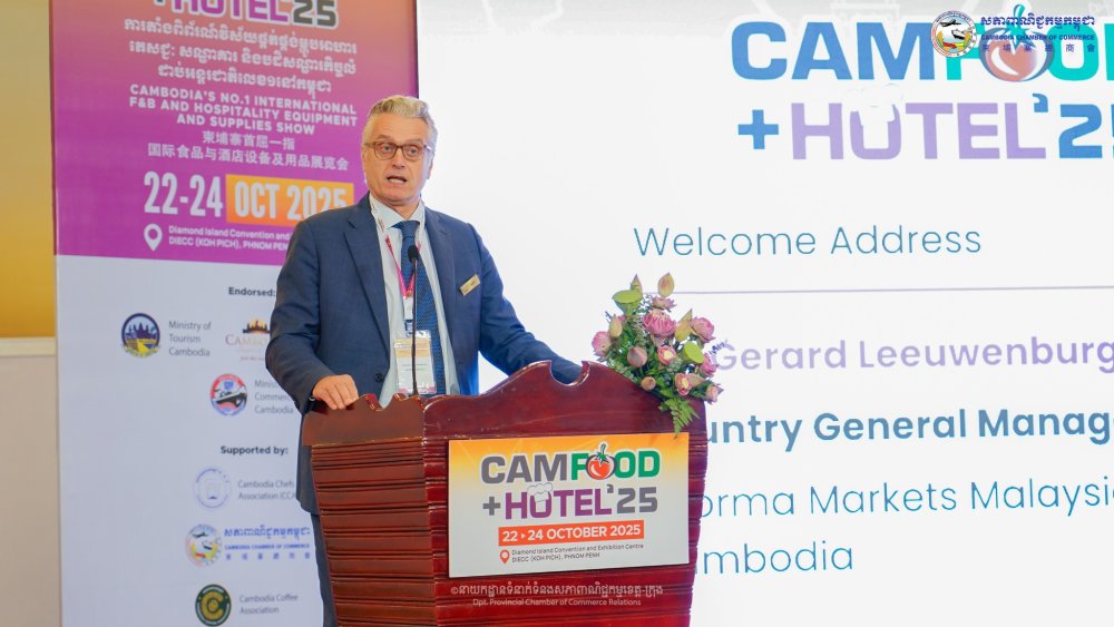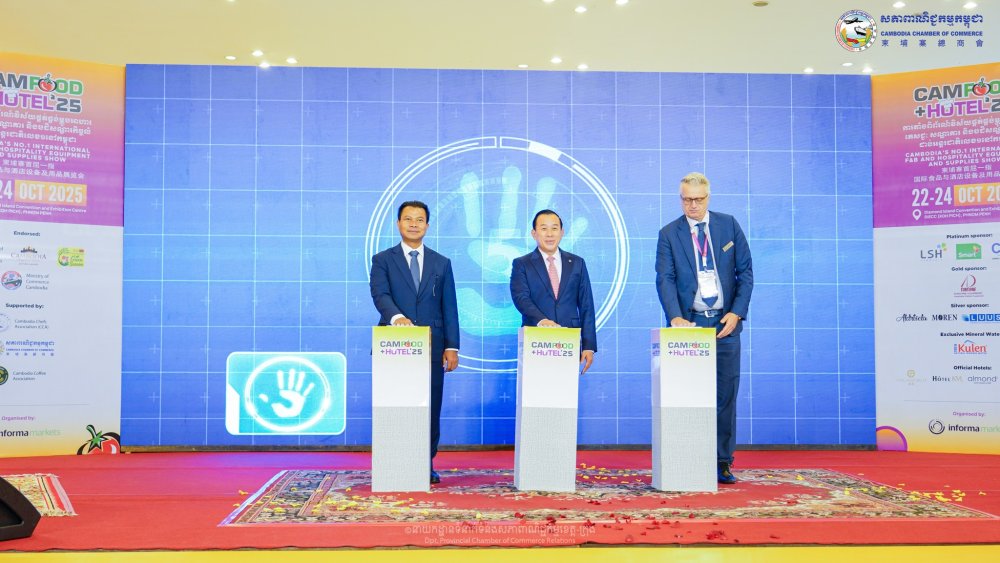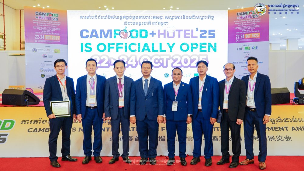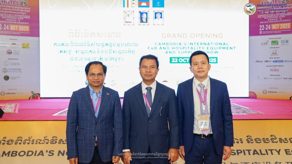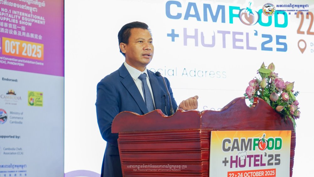 (រាជធានីភ្នំពេញ)៖ នាព្រឹកថ្ងៃពុធ ១កើត ខែកត្តិក ឆ្នាំម្សាញ់ សប្តស័ក ពុទ្ធសករាជ ២៥៦៩ ត្រូវនឹងថ្ងៃទី២២ ខែតុលា ឆ្នាំ២០២៥ ឧកញ៉ា លឹម សុជាតិ អនុប្រធានសភាពាណិជ្ជកម្មកម្ពុជា តំណាងដ៏ខ្ពង់ខ្ពស់ អ្នកឧកញ៉ា គិត ម៉េង ប្រធានសភាពាណិជ្ជកម្មកម្ពុជា និងជាប្រធានក្រុមប្រឹក្សាពិគ្រោះយោបល់ធុរកិច្ចអាស៊ានសម្រាប់កម្ពុជា បានអញ្ជើញចូលរួមជាគណអធិបតី និងថ្លែងមតិចំណាប់អារម្មណ៍ក្នុងពិធីបើកសម្ពោធពិព័រណ៍ «CAMFOOD+CAMHOTEL 2025» ក្រោមអធិបតីភាពដ៏ខ្ពង់ខ្ពស់ ឯកឧត្តម ហួត ហាក់ រដ្ឋមន្ត្រីក្រសួងទេសចរណ៍ នៅមជ្ឈមណ្ឌលសន្និបាត និងពិព័រណ៍កោះពេជ្រ។