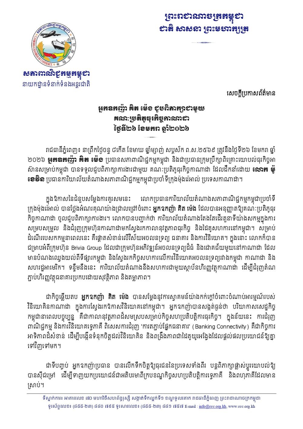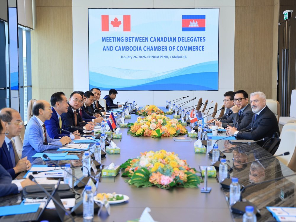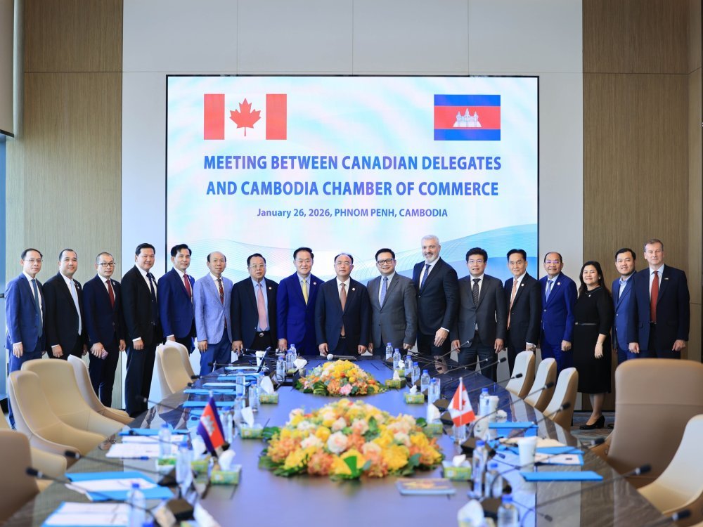 រាជធានីភ្នំពេញ៖ នាព្រឹកថ្ងៃចន្ទ ៨កើត ខែមាឃ ឆ្នាំម្សាញ់ សប្តស័ក ព.ស.២៥៦៩ ត្រូវនឹងថ្ងៃទី២៦ ខែមករា ឆ្នាំ២០២៦ អ្នកឧកញ៉ា គិត ម៉េង ប្រធានសភាពាណិជ្ជកម្មកម្ពុជា និងជាប្រធានក្រុមប្រឹក្សាពិគ្រោះយោបល់ធុរកិច្ចអាស៊ានសម្រាប់កម្ពុជា បានទទួលជួបពិភាក្សាការងារជាមួយ គណៈប្រតិភូធុរកិច្ចកាណាដា ដែលដឹកនាំដោយ លោក ម៉ូ ខេវិន ប្រធានការិយាល័យតំណាងសភាពាណិជ្ជកម្មកម្ពុជាប្រចាំទីក្រុងម៉ុងរ៉េអាល់ ប្រទេសកាណាដា។