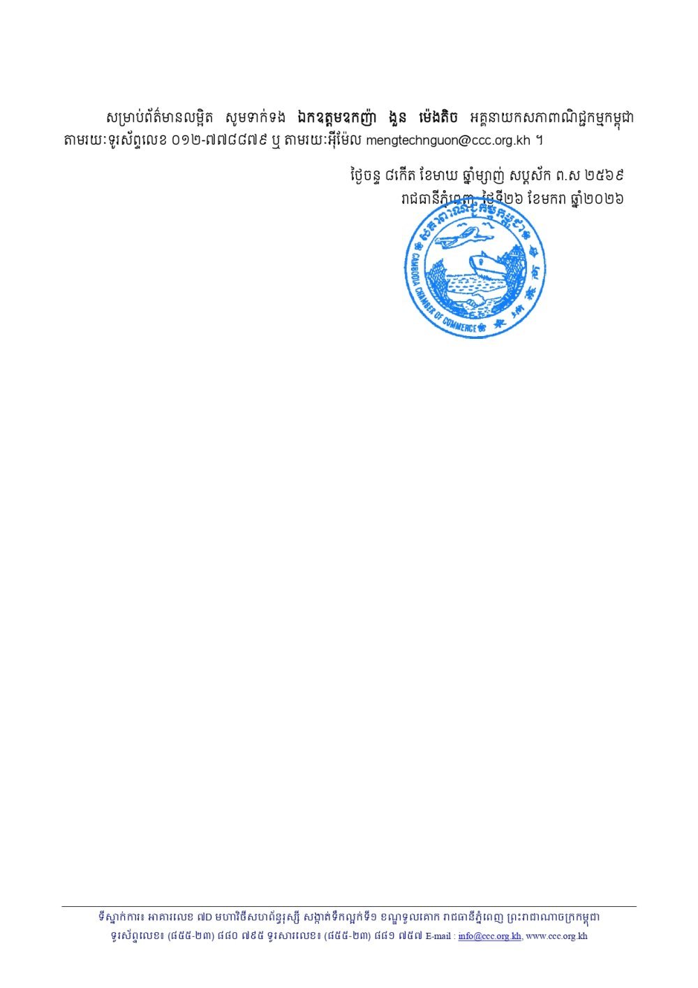 សម្រាប់ព័ត៌មានលម្អិត សូមទាក់ទង ឯកឧត្តមឧកញ៉ា ងួន ម៉េងតិច អគ្គនាយកសភាពាណិជ្ជកម្មកម្ពុជា តាមរយៈទូរស័ព្ទលេខ ០១២-៧៧៨៨៧៩ ឬ តាមរយៈអ៊ីម៉ែល mengtechnguon@ccc.org.kh ។