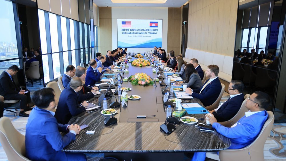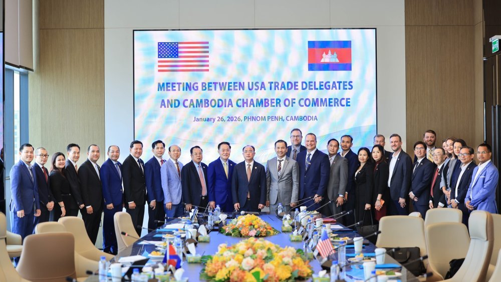 (រាជធានីភ្នំពេញ)៖ នាព្រឹកថ្ងៃចន្ទ ៨កើត ខែមាឃ ឆ្នាំម្សាញ់ សប្តស័ក ព.ស. ២៥៦៩ ត្រូវនឹងថ្ងៃទី២៦ ខែមករា ឆ្នាំ២០២៦ អ្នកឧកញ៉ា គិត ម៉េង ប្រធានសភាពាណិជ្ជកម្មកម្ពុជា និងជាប្រធានក្រុមប្រឹក្សាពិគ្រោះយោបល់ធុរកិច្ចអាស៊ានសម្រាប់កម្ពុជា និងថ្នាក់ដឹកនាំសភាពាណិជ្ជកម្ម បានទទួលជួបជាមួយនឹង ប្រតិភូពាណិជ្ជកម្មសហរដ្ឋអាមេរិក ដែលដឹកនាំដោយ លោក គីមឆា ហួត ប្រធានការិយាល័យតំណាងសភាពាណិជ្ជកម្មកម្ពុជា នៅរដ្ឋកាលីហ្វ័រញ៉ា សហរដ្ឋអាមេរិក។