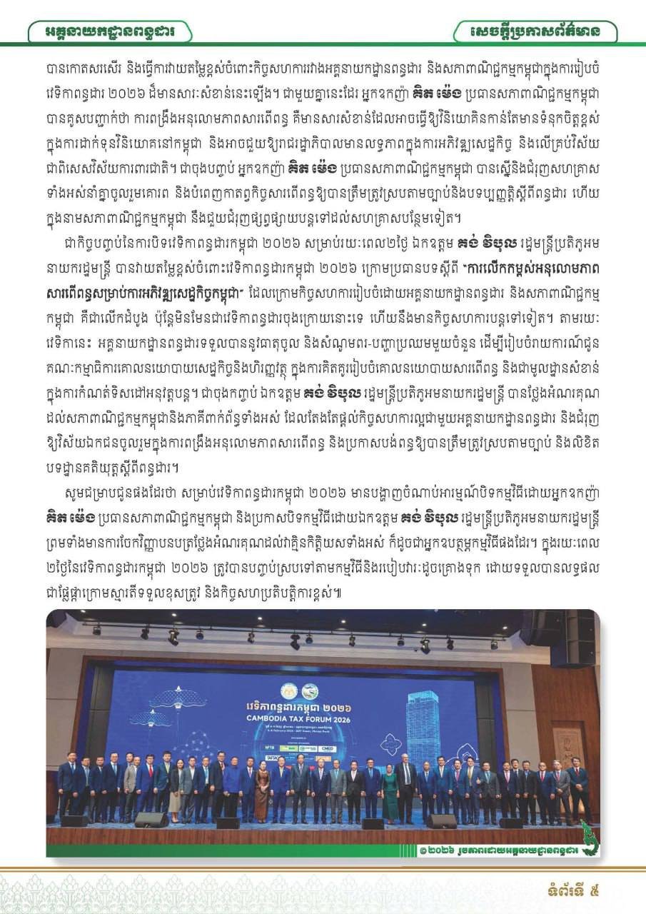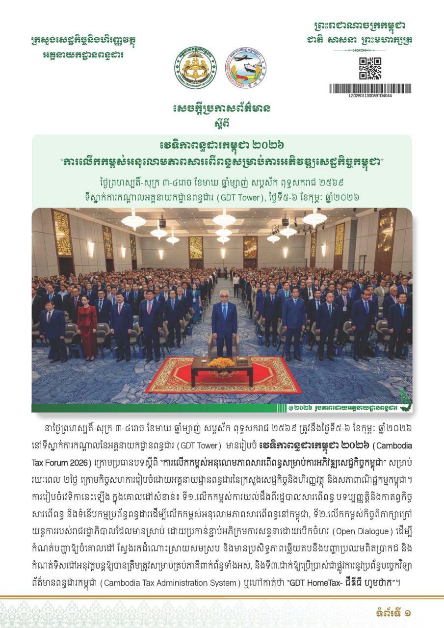 សេចក្តីប្រកាសព័ត៌មាន ស្តីពីណវេទិកាពន្ធដារកម្ពុជា ២០២៦ “ការលើកកម្ពស់អនុលោមភាពសារពើពន្ធសម្រាប់ការអភិវឌ្ឍសេដ្ឋកិច្ចកម្ពុជា”
