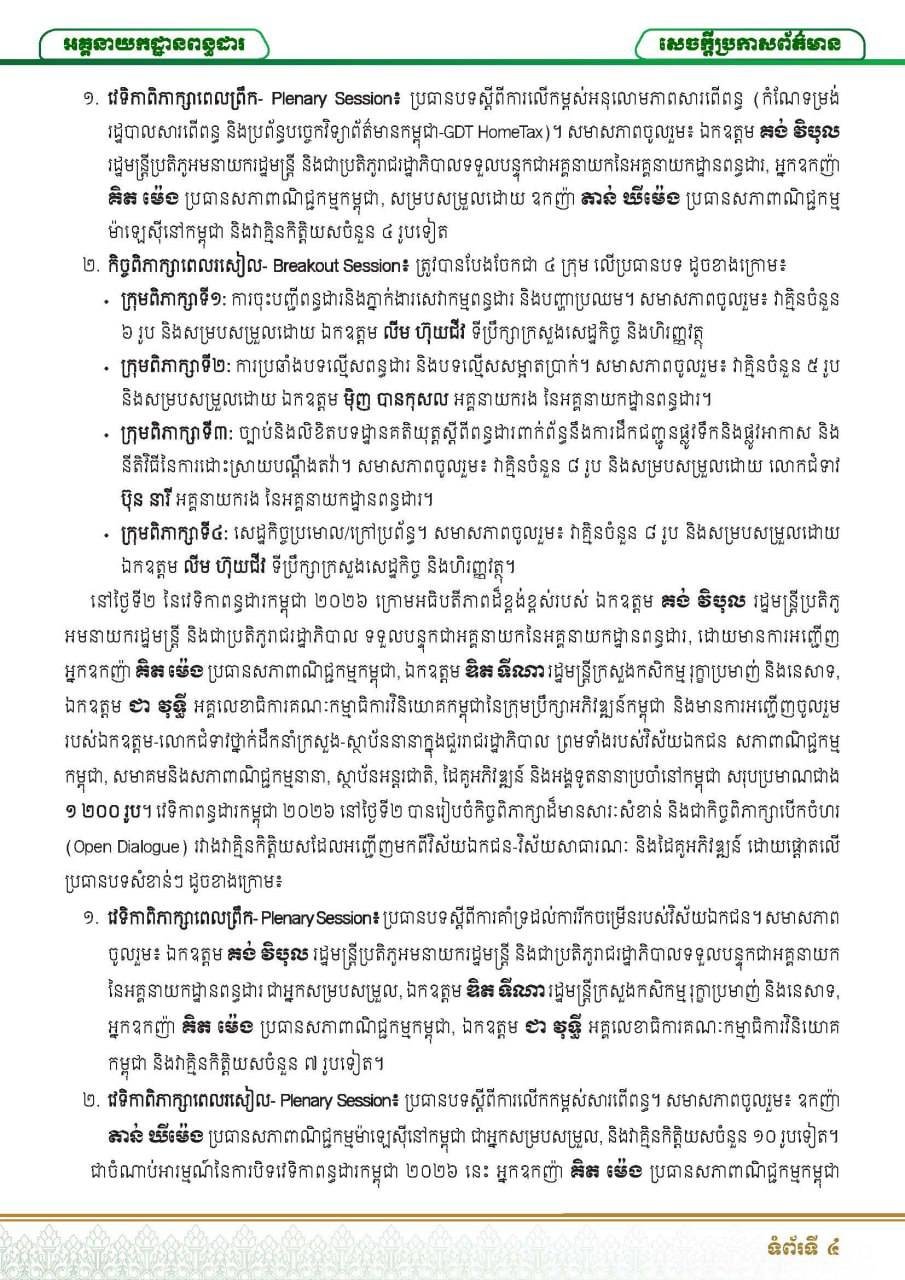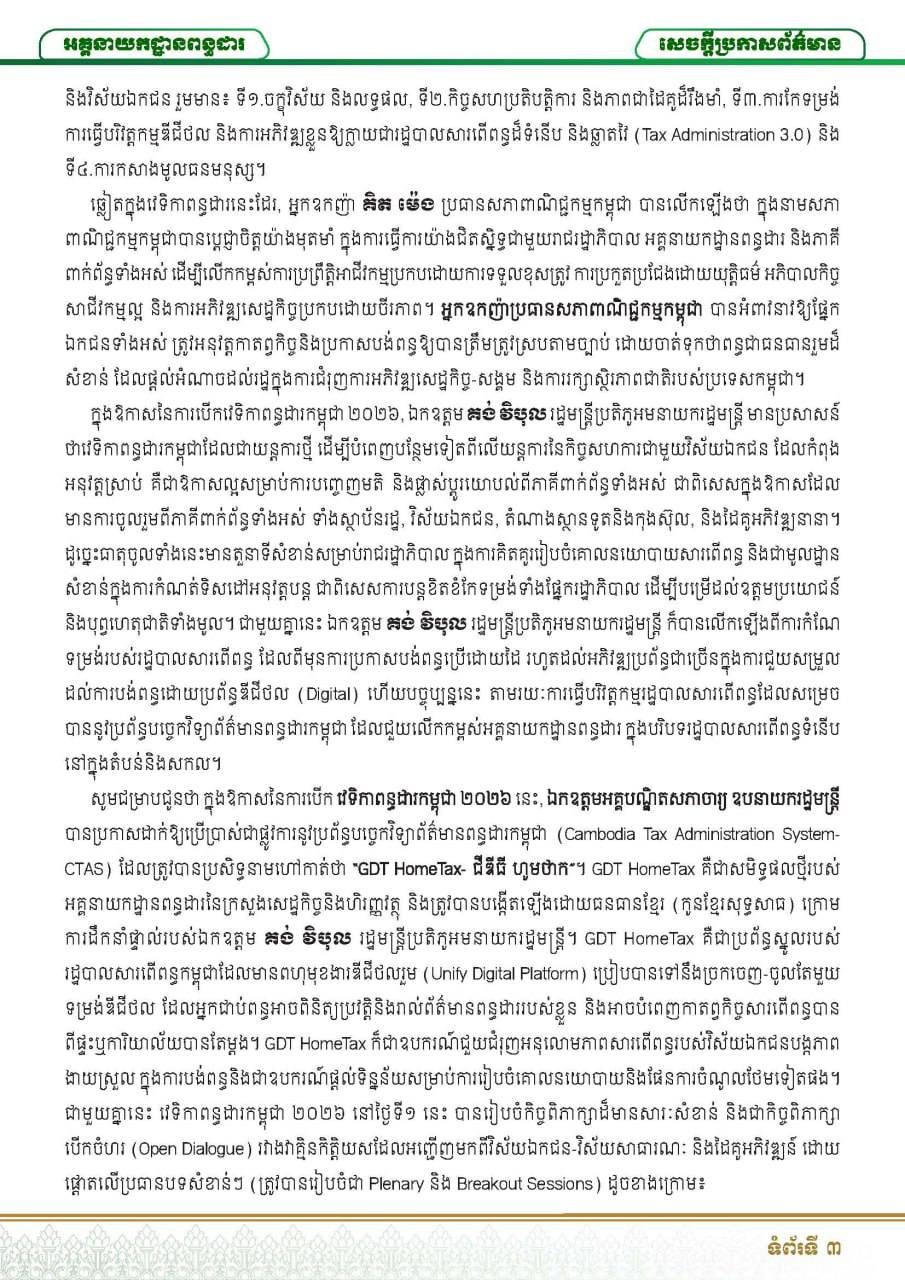នាថ្ងៃព្រហស្បតិ៍-សុក្រ ៣-៤រោច ខែមាឃ ឆ្នាំម្សាញ់ សប្តស័ក ពុទ្ធសករាជ ២៥៦៩ ត្រូវនឹងថ្ងៃទី៥-៦ ខែកុម្ភៈ ឆ្នាំ២០២៦ នៅទីស្នាក់ការកណ្តាលនៃអគ្គនាយកដ្ឋានពន្ធដារ (GDT Tower) មានរៀបចំ វេទិកាពន្ធដារកម្ពុជា ២០២៦ (Cambodia Tax Forum 2026) ក្រោមប្រធានបទស្តីពី “ការលើកកម្ពស់អនុលោមភាពសារពើពន្ធសម្រាប់ការអភិវឌ្ឍសេដ្ឋកិច្ចកម្ពុជា” សម្រាប់ រយៈពេល ២ថ្ងៃ ក្រោមកិច្ចសហការរៀបចំដោយអគ្គនាយដ្ឋានពន្ធដារនៃក្រសួងសេដ្ឋកិច្ចនិងហិរញ្ញវត្ថុ និងសភាពាណិជ្ជកម្មកម្ពុជា។ ការរៀបចំវេទិកានេះឡើង ក្នុងគោលដៅសំខាន់៖ ទី១.លើកកម្ពស់ការយល់ដឹងពីរដ្ឋបាលសារពើពន្ធ បទប្បញ្ញត្តិនិងកាតព្វកិច្ច សារពើពន្ធ និងទំនើបកម្មប្រព័ន្ធពន្ធដារដើម្បីលើកកម្ពស់អនុលោមភាពសារពើពន្ធនៅកម្ពុជា, ទី២.លើកកម្ពស់កិច្ចពិភាក្សាក្រៅយន្តការរបស់រាជរដ្ឋាភិបាលដែលមានស្រាប់ ដោយប្រកាន់ខ្ជាប់អភិក្រមការសន្ទនាដោយបើកចំហរ (Open Dialogue) ដើម្បី កំណត់បញ្ហាឱ្យចំគោលដៅ ស្វែងរកដំណោះស្រាយសមស្រប និងមានប្រសិទ្ធភាពឆ្លើយតបនឹងបញ្ហាប្រឈមពិតប្រាកដ និងកំណត់ទិសដៅអនុវត្តបន្តឱ្យបានត្រឹមត្រូវសម្រាប់គ្រប់ភាគីពាក់ព័ន្ធទាំងអស់, និងទី៣.ដាក់ឱ្យប្រើប្រាស់ជាផ្លូវការនូវប្រព័ន្ធបច្ចេកវិទ្យាព័ត៌មានពន្ធដារកម្ពុជា (Cambodia Tax Administration System) ឬហៅកាត់ថា “GDT HomeTax- ជីឌីធី ហូមថាក”។