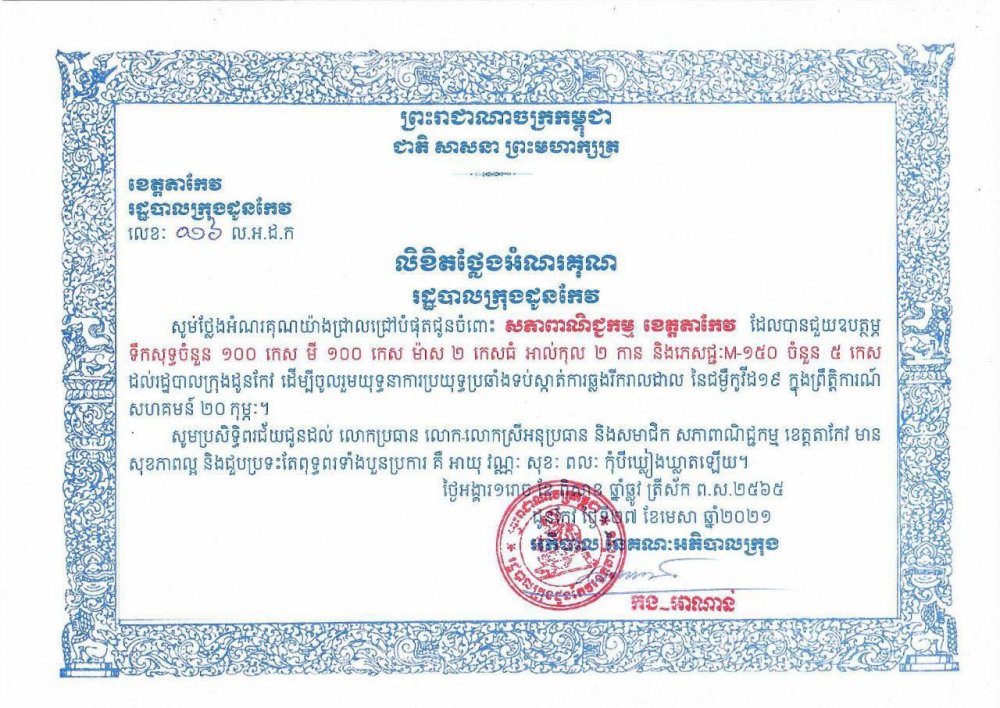នៅសាលាក្រុងដូនកែវ ថ្ងៃទី២៧ ខែមេសា ឆ្នាំ២០២១ លោក ជីប ភក្តីភាព អនុប្រធានសភាពាណិជ្ជកម្មកម្ពុជា និងជាប្រធានសភាពាណិជ្ជកម្មខេត្តតាកែវ លោកអនុប្រធាន សមាជិក សមាជិកា ព្រមទាំងសមាជិកទីប្រឹក្សារ បាននាំយកគ្រឿងឧបភោគបរិភោគមួយចំនួនជូន លោក កង អាណាន់ អភិបាល នៃគណៈអភិបាលក្រុងដូនកែវ ដើម្បីរួមចំណែកក្នុងការប្រយុទ្ធប្រឆាំងការរីករាលដាលនៃជំងឺកូវីដ១៩ រួមមាន មីចំនួន ១០០កេស ទឹកបរិសុទ្ធចំនួន ១០០កេស ម៉ាសចំនួន ២កេសធំ អាល់កុល ២កាន និងភេសជ្ជៈ M-150ចំនួន ៥កេស។