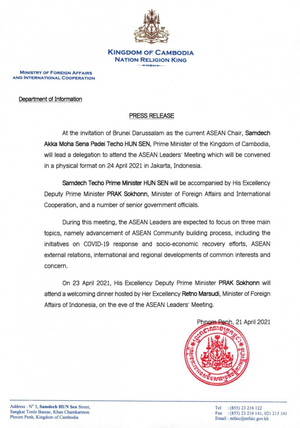 សេចក្តីប្រកាសព័ត៌មាន ស្តីពីសម្តេចអគ្គមហាសេនាបតីតេជោ ហ៊ុន សែន នាយករដ្ឋមន្រ្តីនៃព្រះរាជាណាចក្រកម្ពុជា នឹងដឹកនាំគណៈប្រតិភូជាន់ខ្ពស់អញ្ជើញទៅចូលរួមដោយផ្ទាល់ក្នុងកិច្ចប្រជុំរបស់មេដឹកនាំអាស៊ាន ដែលនឹងប្រព្រឹត្តទៅនៅថ្ងៃទី ២៤ ខែមេសា ឆ្នាំ២០២១ នៅទីក្រុងហ្សាការតា ប្រទេសឥណ្ឌូនេស៊ី។